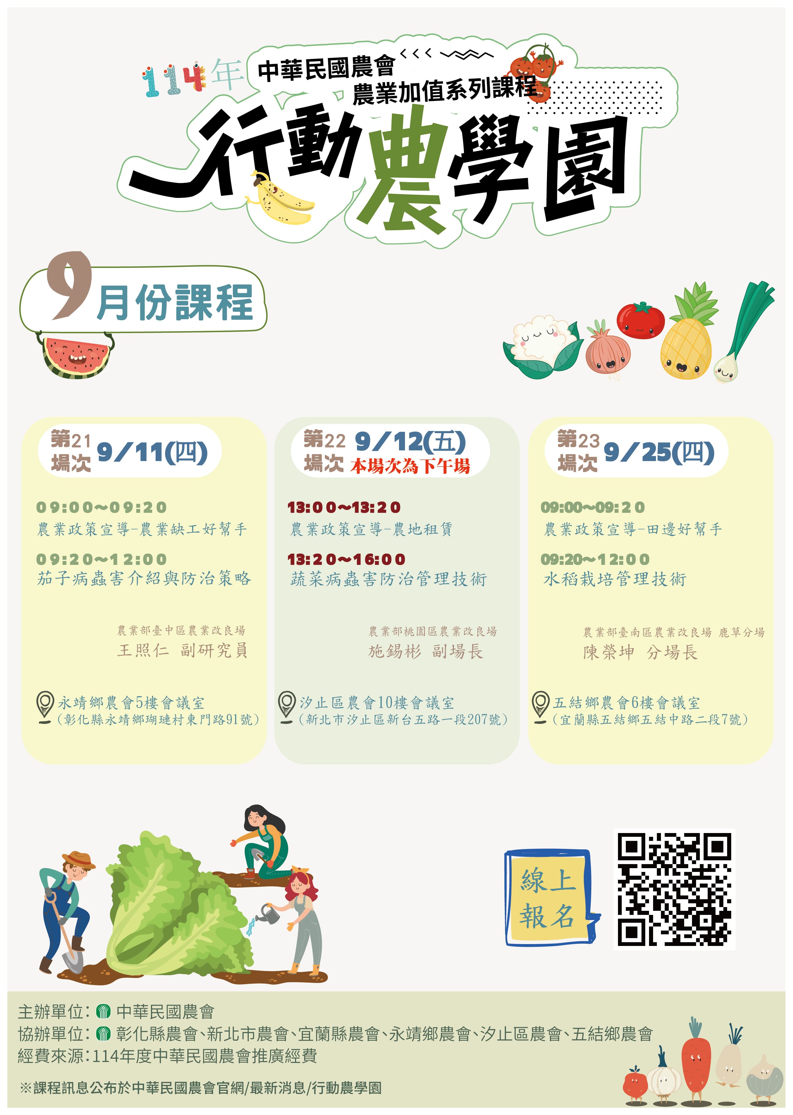 一、參加對象:產銷班班員、農民、青年農民及農會人員或對從事農業有興趣者(額滿為止)。 二、辦理場次、主題、時間及地點 (一)第二十一場次「茄子病蟲害介紹與防治策略」:9月11日(四)9:00-12:00,永靖鄉農會。 (二)第二十二場次「蔬菜病蟲害防治管理技術」:9月12日(五)13:00-16:00,汐止區農會。 (三)第二十三場次「水稻管理栽培技術」:9月25日(四)9:00-12:00,五結鄉農會。