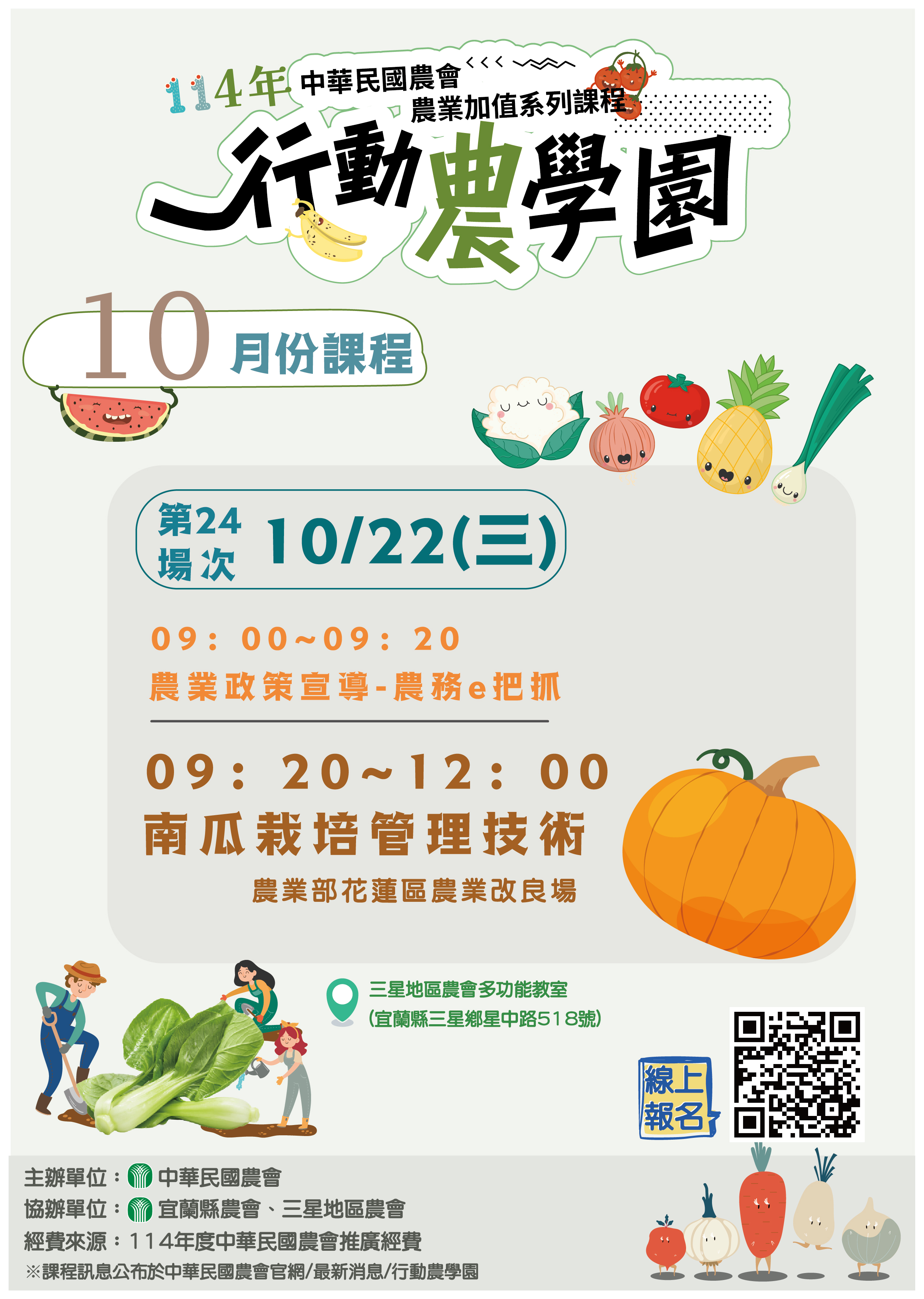 一、參加對象:產銷班班員、農民、青年農民及農會人員或對從事農業有興趣者(額滿為止)。 二、辦理場次、主題、時間及地點:第二十四場次「南瓜栽培管理技術」:10月22日(三)9:00-12:00,三星地區農會。