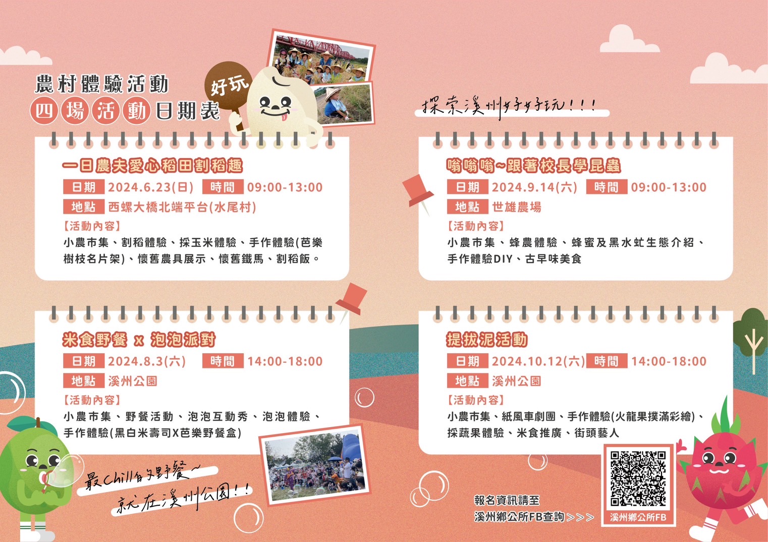 日期:2024.6.23(日) 時間:09:00-13:00 地點:西螺大橋北端平台(水尾村) 活動內容:小農市集、割稻體驗、採玉米體驗、手作體驗、懷舊農具展示、懷舊鐵馬、割稻飯。 主辦單位:溪州鄉公所、溪州鄉農會 指導單位:彰化縣政府、經濟部水利署第四河川局、謝衣鳳立委暨謝典林議長服務處、溪州鄉民代表會 協辦單位:各社區發展協會、各村辦公處