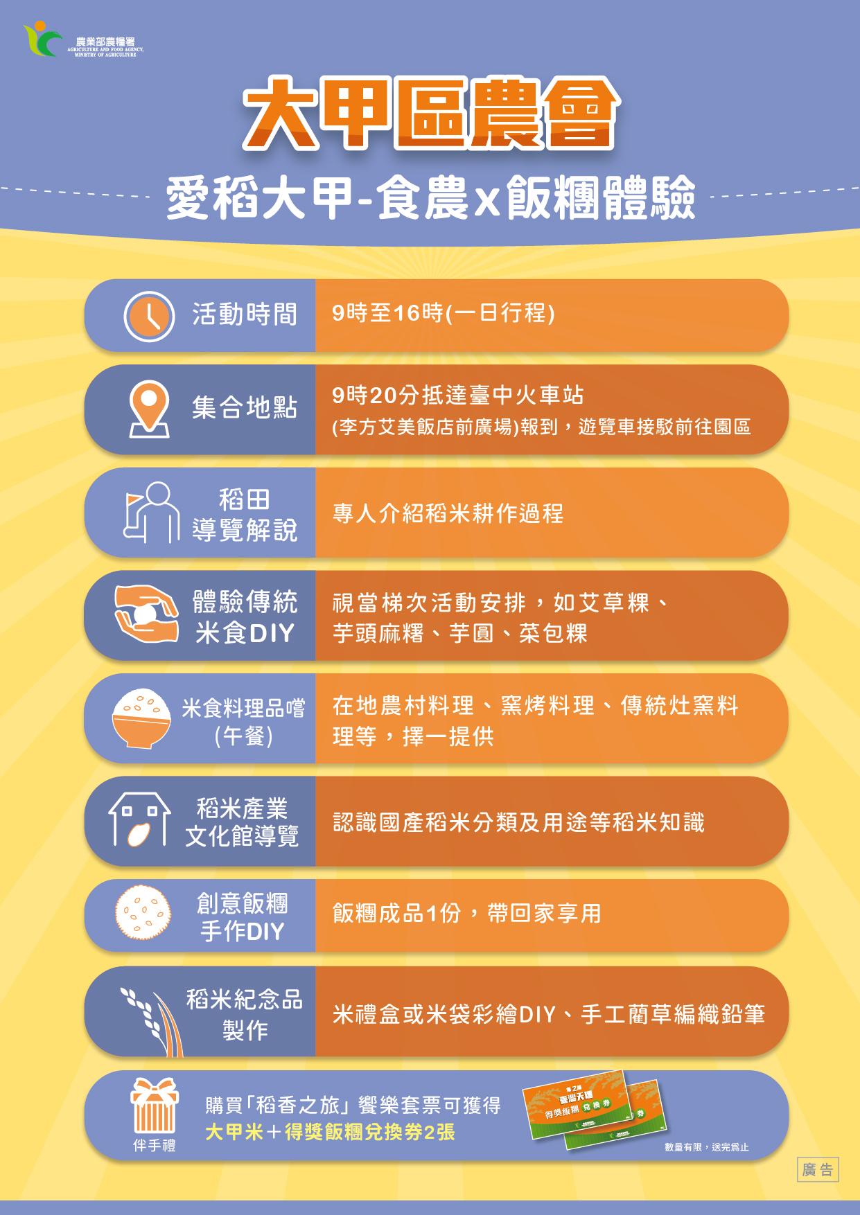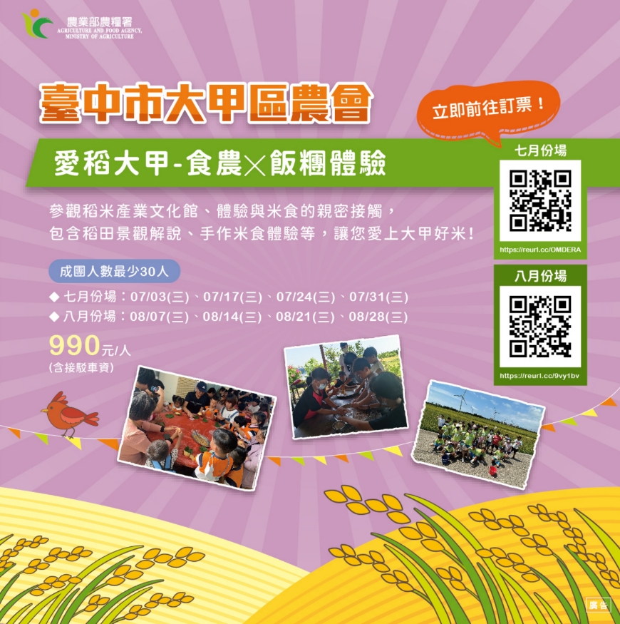 活動日期:7/3(三)、7/17(三)、7/24(三)、7/31(三) 活動內容:稻田導覽解說、體驗傳統米食DIY、米食料理品嚐、稻米產業文化館導覽、創意飯糰手作DIY、稻米紀念品製作 洽詢專線:04-26863990分機133推廣部陳先生 主辦單位:農業部農糧署、大甲區農會