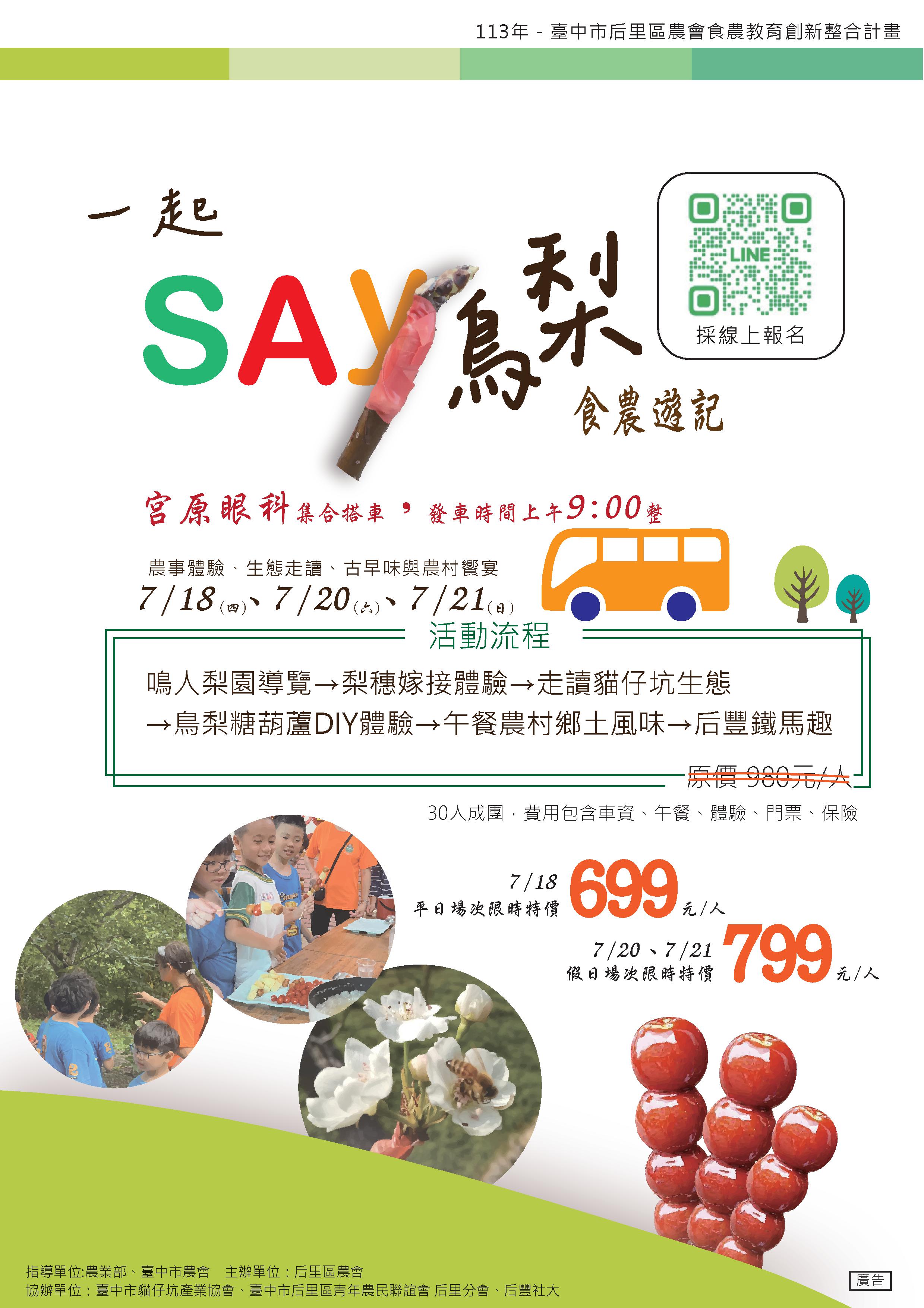 活動日期:7月18日(四)、7月20日(六)、7月21日(日) 活動內容:鳴人梨園導覽、梨穗嫁接體驗、走讀貓仔坑生態、鳥梨糖葫蘆DIY體驗、農村鄉土風味餐、后豐鐵馬趣 指導單位:農業部、臺中市農會 主辦單位:后里區農會 協辦單位:臺中市貓仔坑產業協會、臺中市后里區青年農民聯誼會后里分會、后豐社大