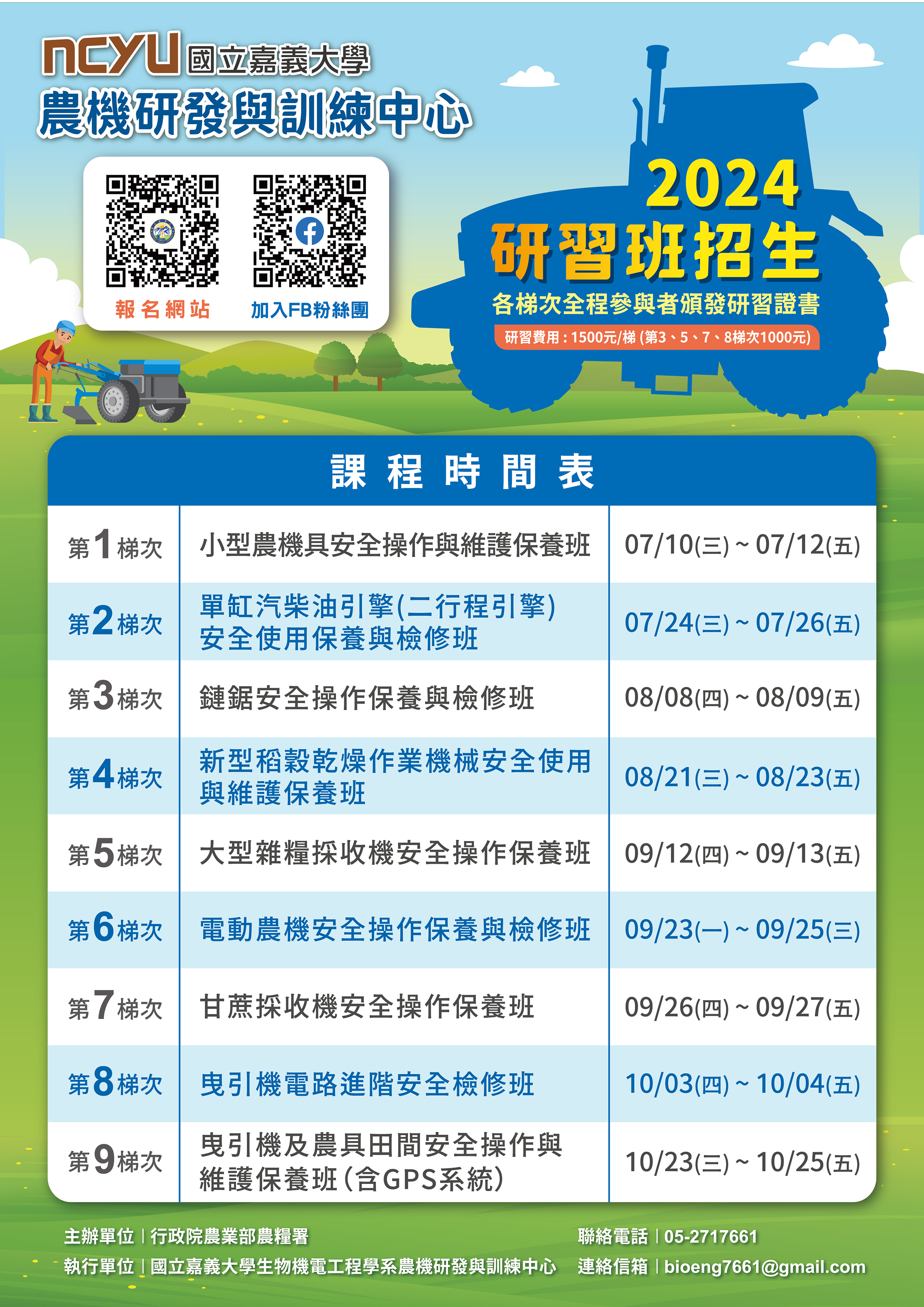 一、辦理時間:113年8月21日(星期三)至8月23日(星期五)上午8時10分至下午5時。 二、辦理地點:本校蘭潭校區(嘉義市學府路300號)機電館1樓氣壓教室。 三、費用:1,500元/梯次(含講義、午晚餐、住宿)。 四、報名方式:即日起至8月7日(星期三)或額滿為止(名額30名),採線上報名。 五、聯絡方式:翁小姐,電話05-2717661,電子信箱:nosyo@mail.ncyu.edu.tw。