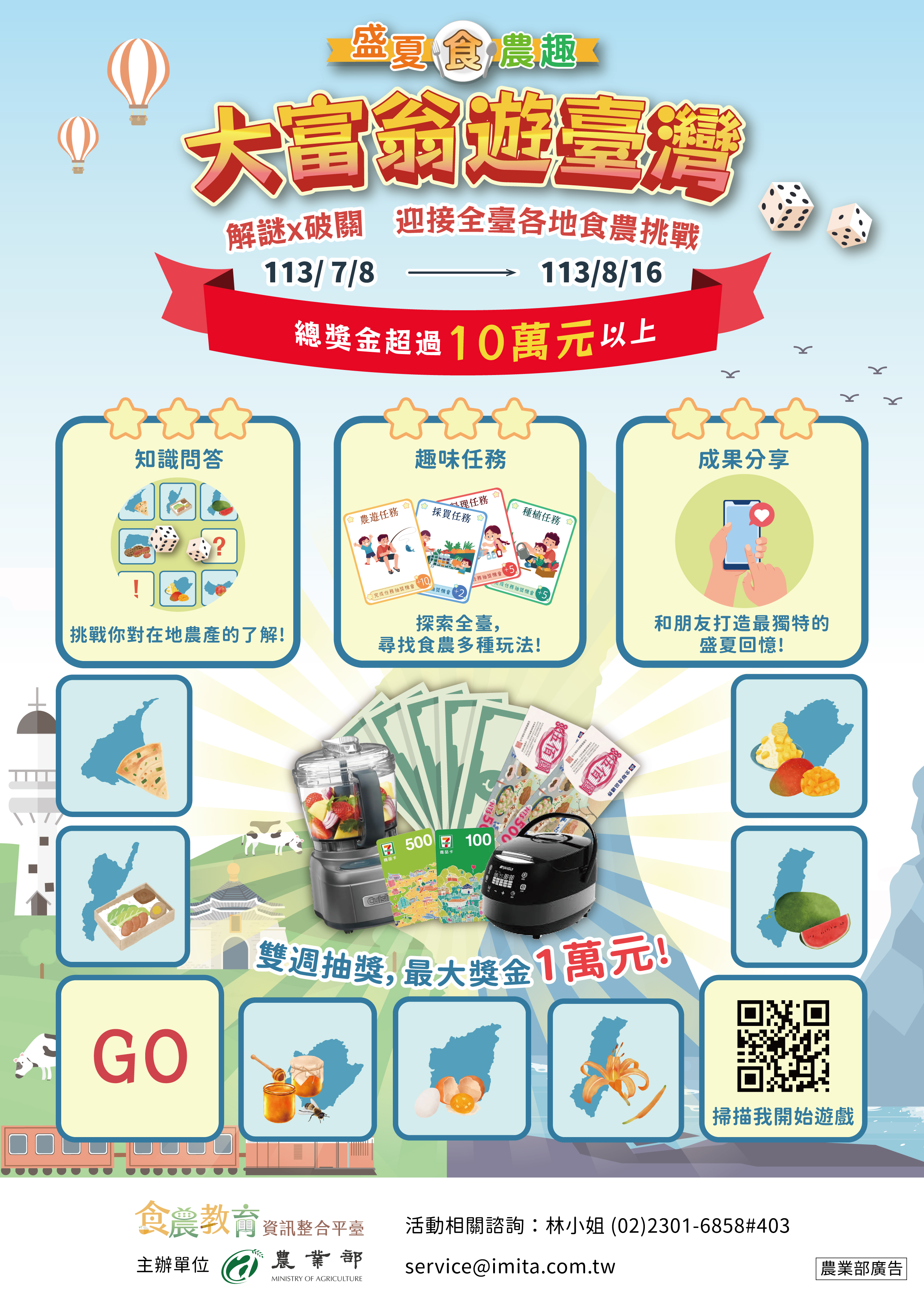 ※為強化食農教育素養,並促使大眾更加瞭解食農教育,訂於113年7月8日至8月16日舉辦「盛夏食農趣:大富翁遊臺灣」食農教育推廣活動,提供食農教育相關知識問答、任務體驗與成果分享等遊戲,參與活動即可抽獎,總獎金超過10萬元,歡迎踴躍參與。 ※如有任何問題,請電郵至service@imita.com.tw或電洽(02)2301-6858分機403林小姐詢問。 ※詳情請見農業部函及活動DM。