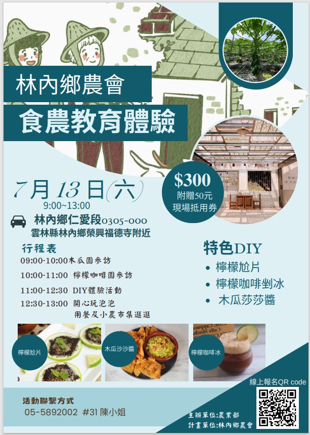活動日期:7月13日(星期六) 活動內容:木瓜園、檸檬咖啡園參訪、DIY體驗活動、小農市集 聯絡窗口: 05-5892002 #31 陳小姐(時間: 8:30-17:00) 主辦單位: 農業部 計畫單位: 林內鄉農會