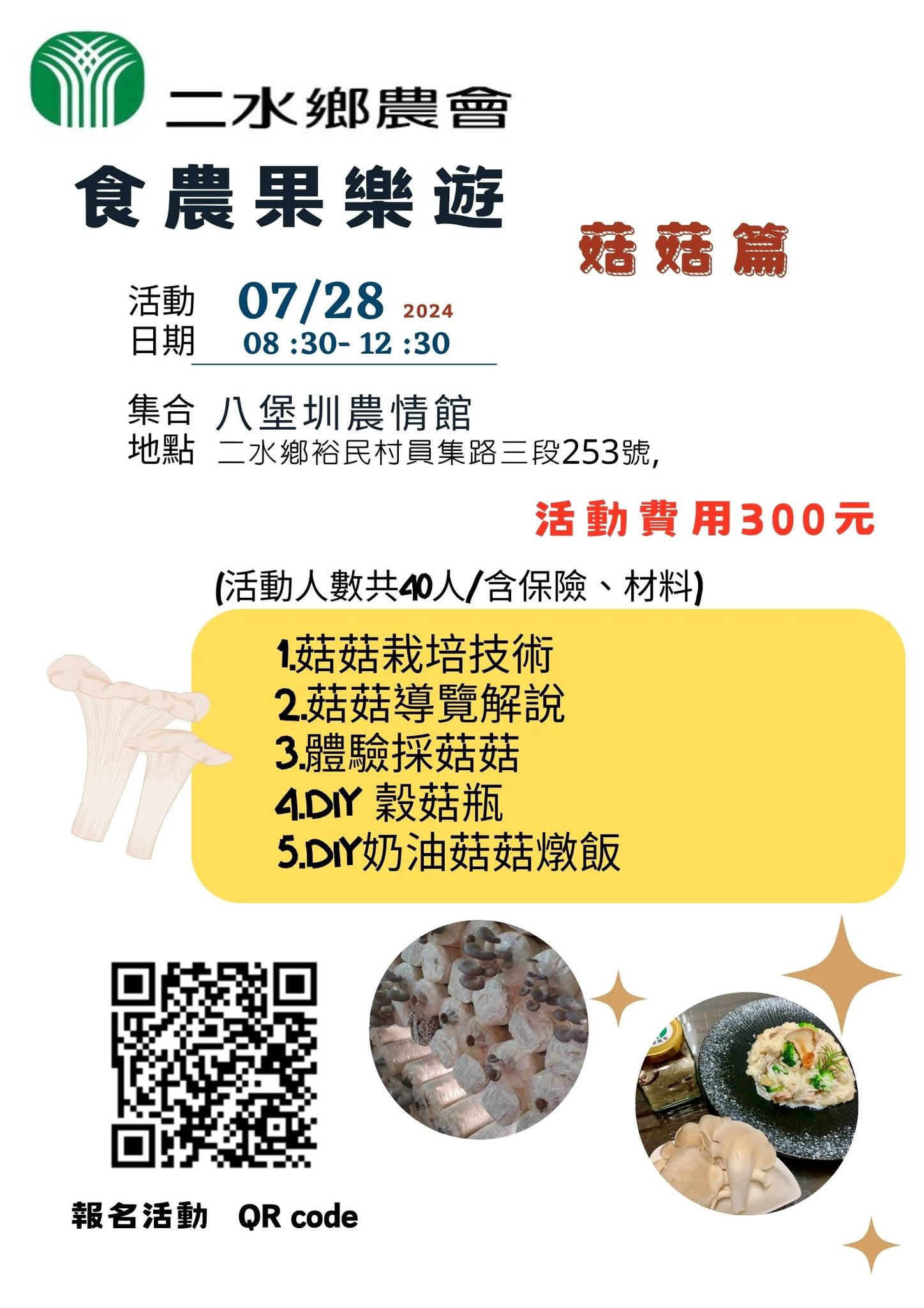 活動日期:7月28日(日) 活動內容:菇菇栽培技術、導覽解說、體驗採菇菇、DIY穀菇瓶、DIY奶油菇菇燉飯 集合地點:八堡圳農情館 洽詢專線:推廣部 04-8792111