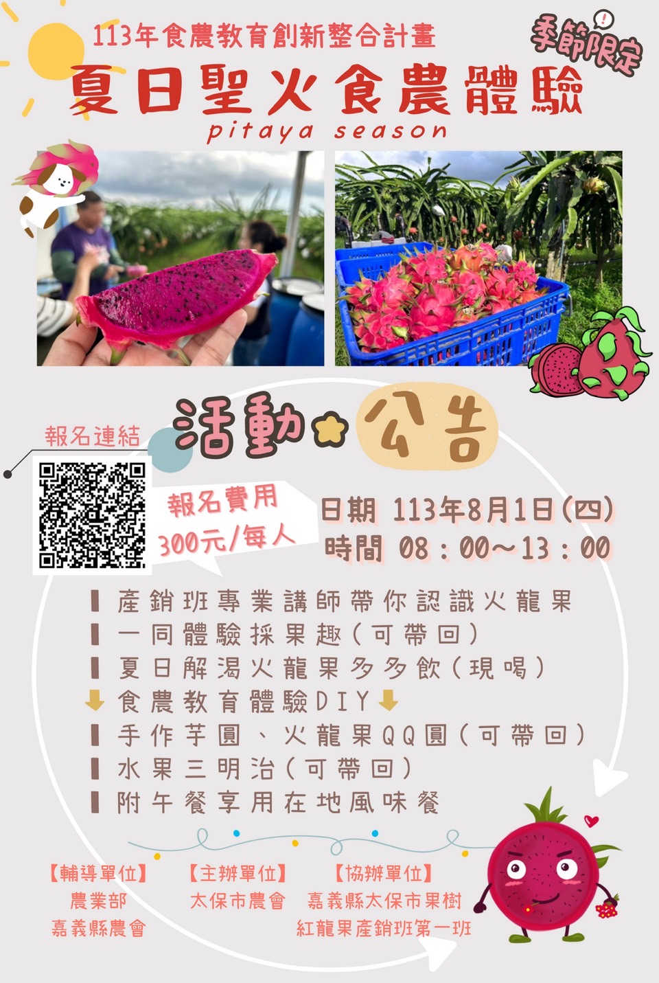 活動日期:8/1(四) 活動內容:認識火龍果、體驗採果趣、火龍果多多飲、食農教育體驗DIY 輔導單位:農業部、嘉義縣農會 主辦單位:太保市農會 協辦單位:嘉義縣太保市果樹紅龍果產銷班第一班