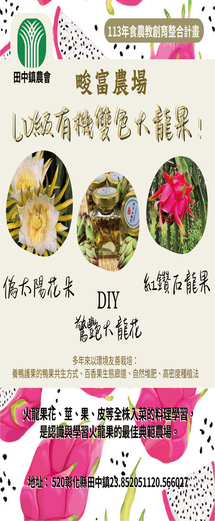 活動地點:畯富農場 活動內容:偽太陽花、紅鑽石龍果、驚艷火龍花、DIY 連絡電話:田中鎮農會 04-8749211 #207