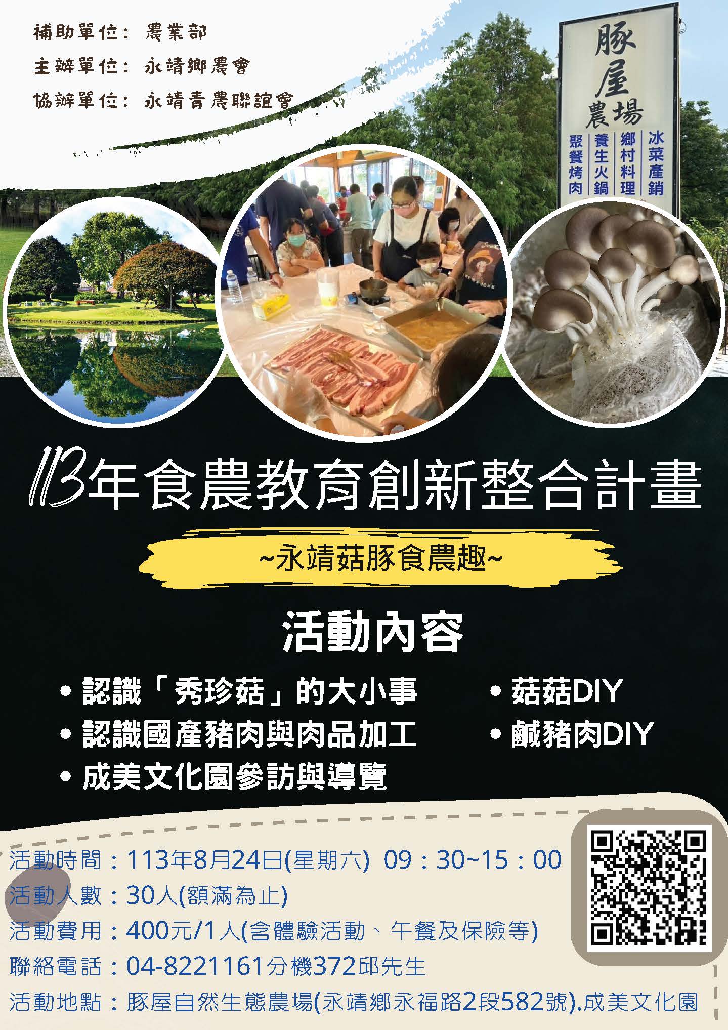活動日期:113年8月24日(星期六) 活動內容:認識秀珍菇的大小事、認識國產豬肉與肉品加工、菇菇/鹹豬肉DIY、成美文化園參訪與導覽 聯絡電話:04-8221161分機372邱先生 活動地點:豚屋自然生態農場、成美文化園 *活動報名請掃DM QRcode填資料報名。 補助單位:農業部 主辦單位:永靖鄉農會 協辦單位:永靖青農聯誼會