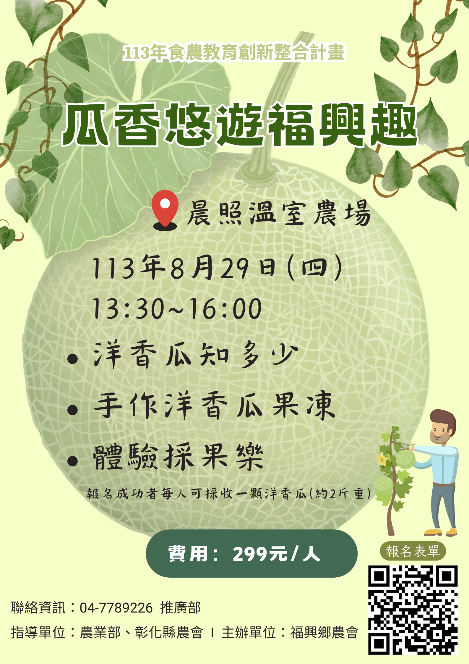 活動日期:8月29日(四) 活動內容:洋香瓜知多少、手作洋香瓜果凍、體驗採果樂 聯絡資訊:04-7789226 推廣部 指導單位:農業部、彰化縣農會 主辦單位:福興鄉農會
