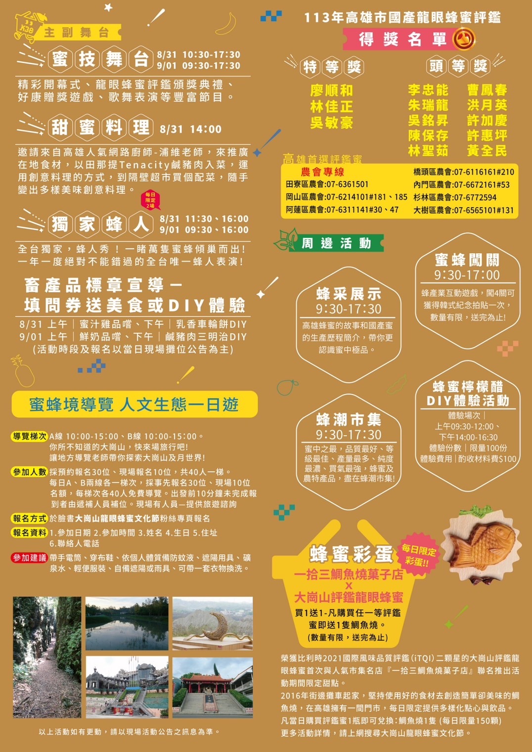 活動日期:8月31日~9月1日(六、日) 活動內容:蜜技舞台、甜蜜料理、獨家蜂人、蜂采展示、蜜蜂闖關、蜂蜜檸檬醋DIY、蜂潮市集