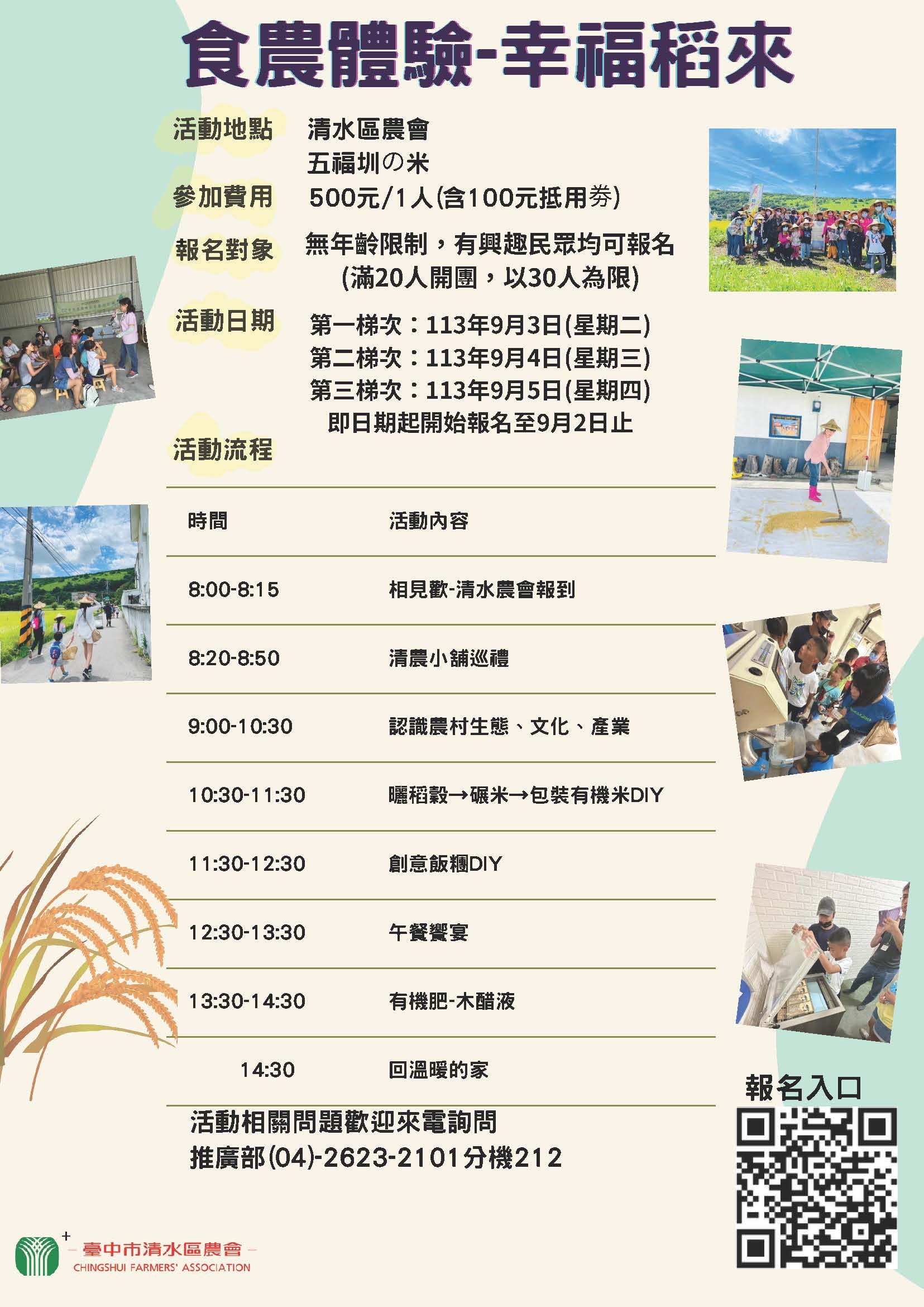 活動日期: (一)第一梯次:113年9月3日(星期二) (二)第二梯次:113年9月4日(星期三) (三)第二梯次:113年9月5日(星期四) 活動內容: (一)認識農村生態、文化、產業 (二)曬稻穀、碾米、包裝有機米 (三)創意飯糰、有機肥-木醋液 洽詢電話:推廣部04-26232101分機212