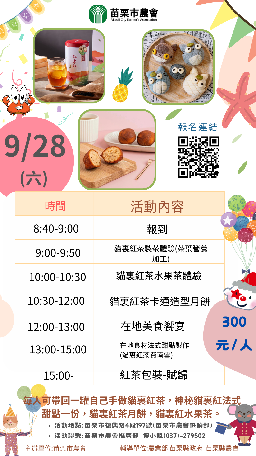 活動日期:9月28日(六) 活動地點:苗栗市農會供銷部 活動內容:貓裏紅茶製茶體驗、水果茶體驗、卡通造型月餅、法式甜點、紅茶包裝 活動聯繫:苗栗市農會推廣部 傅小姐(037)279502 主辦單位:苗栗市農會 輔導單位:農業部、苗栗縣政府、苗栗縣農會
