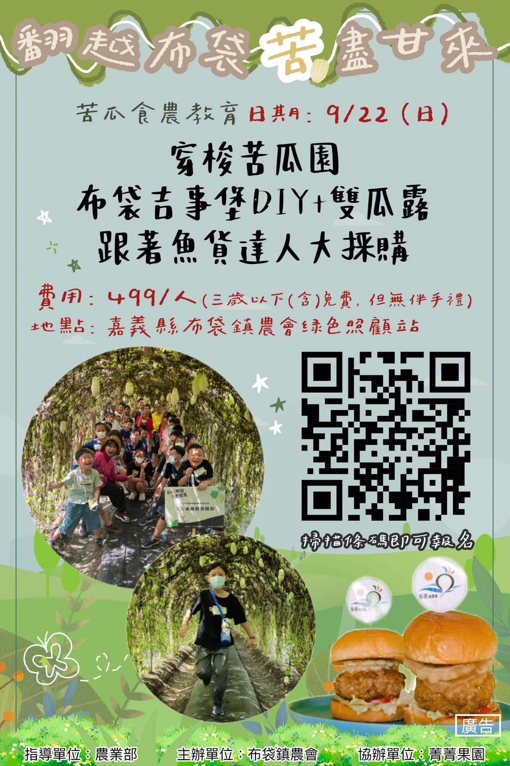 活動日期:9月22日(星期日) 活動內容:穿梭苦瓜園、布袋吉事堡DIY+雙瓜露、跟著魚貨達人大採購 活動地點:嘉義縣布袋鎮農會綠色照顧站 指導單位:農業部 主辦單位:布袋鎮農會 協辦單位:菁菁果園