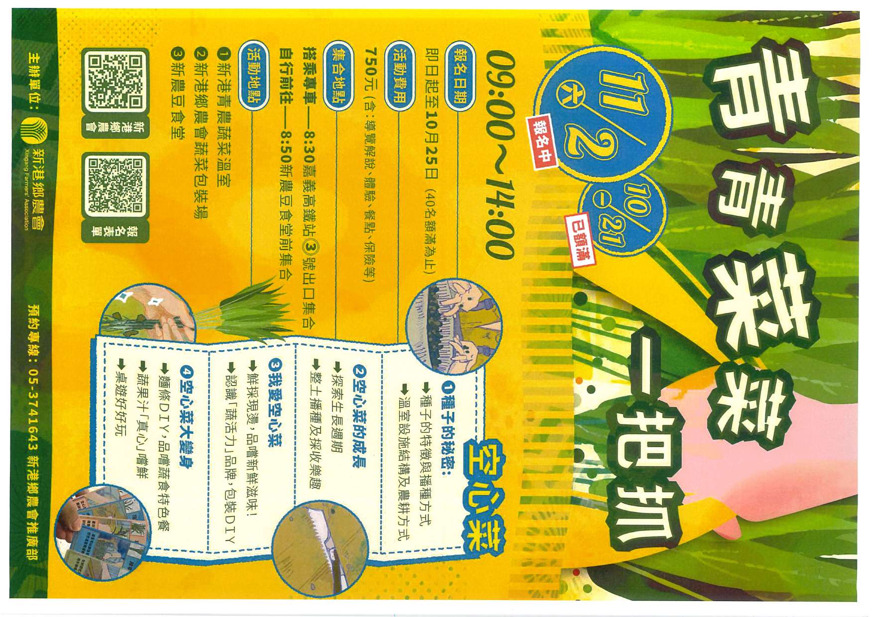 活動日期:10/21(已額滿)、11/2 活動內容:種子的秘密、空心菜旳成長、我愛空心菜、空心菜大變身 活動地點:新港青農蔬菜溫室、新港鄉農會蔬菜包裝場、新農豆食堂 預約專線:05-3741643推廣部 主辦單位:新港鄉農會