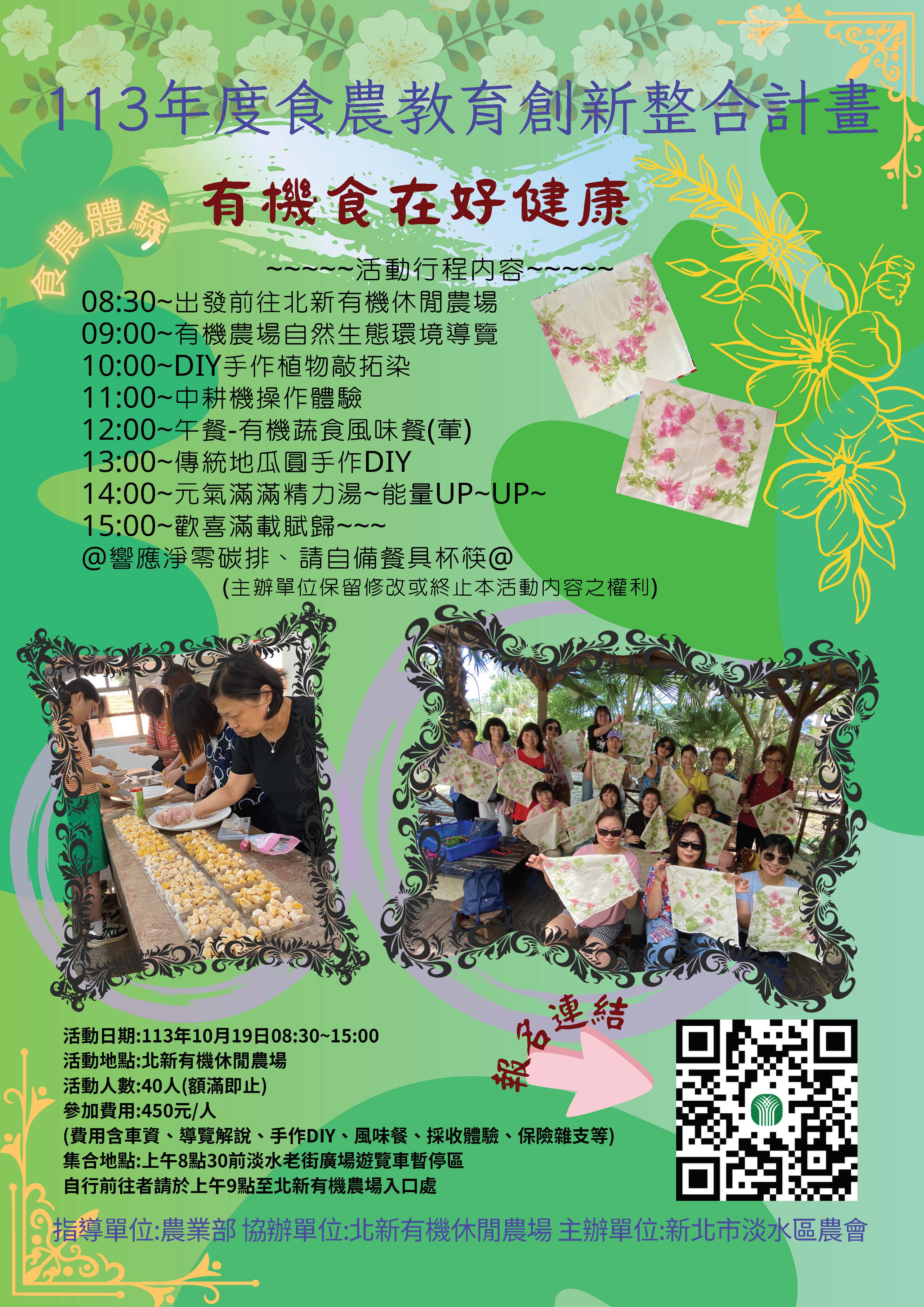 活動日期:10月19日 活動地點:北新有機休閒農場 活動內容:有機農場生態導覽、手作植物敲拓染、中耕機操作體驗、地瓜圓手作DIY、元氣滿滿精力湯 指導單位:農業部 主辦單位:新北市淡水區農會 協辦單位:北新有機休閒農場