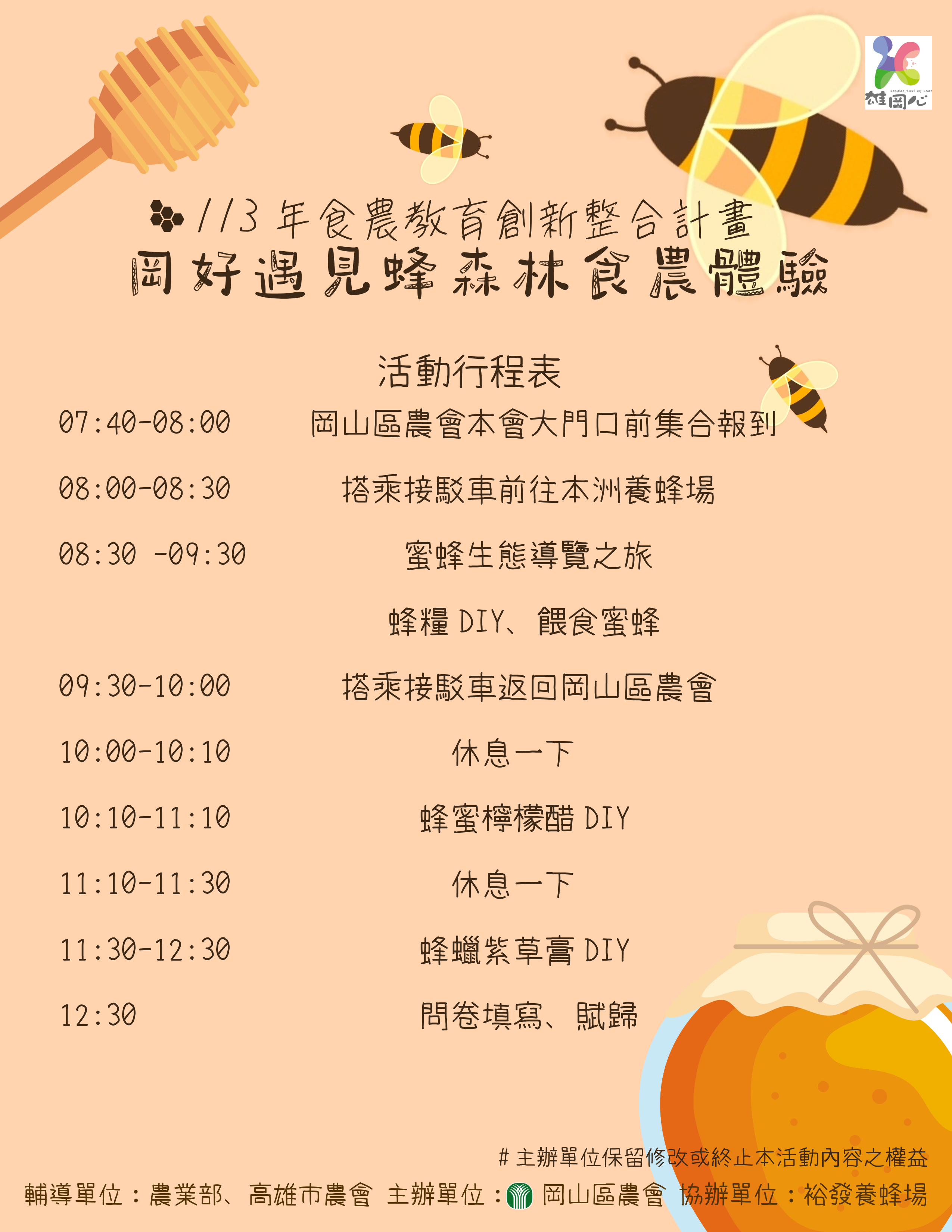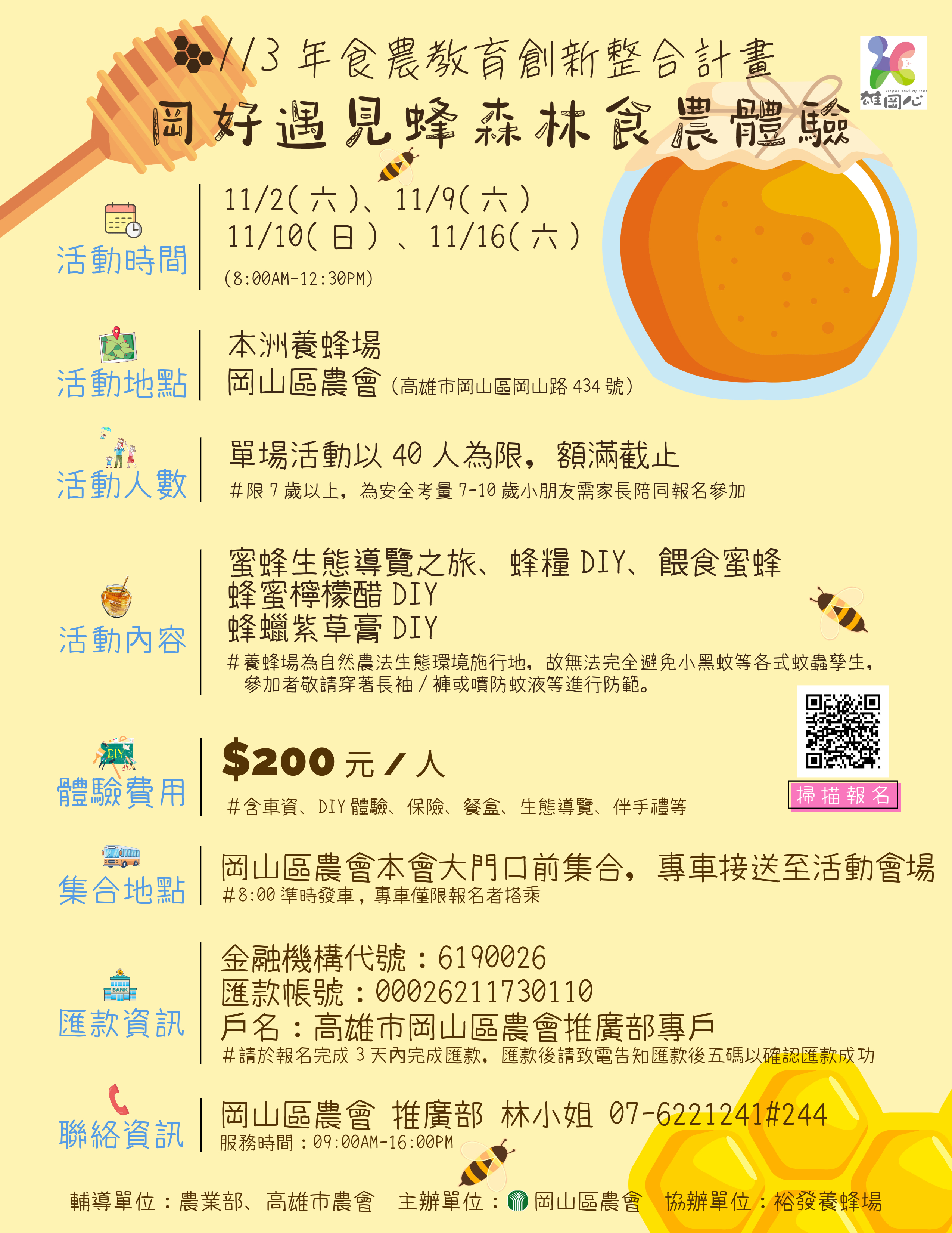 活動時間:11/2(六)、11/9(六)、11/10(日)、11/16(六) 活動內容:蜜蜂生態導覽之旅、蜂糧DIY、餵食蜜峰、蜂蜜檸檬醋DIY、蜂蠟紫草膏DIY 聯絡資訊:岡山區農會 推廣部林小姐 07-6221241#244 輔導單位:農業部、高雄市農會 主辦單位:岡山區農會 協辦單位:裕發養蜂場