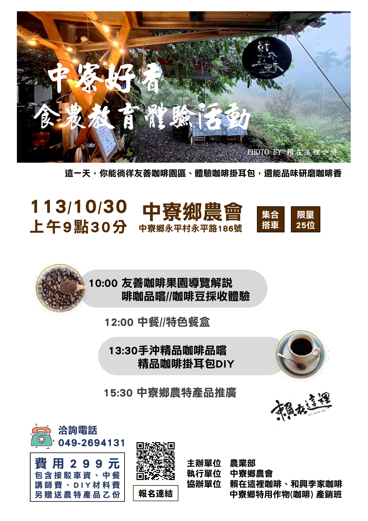 活動日期:10月30日(星期三) 活動內容:友善咖啡果園導覽解說、手沖精品咖啡品嚐 洽詢電話:推廣部049-2694131 主?單位:農業部 執行單位:中寮鄉農會 協辦單位:賴在這裡咖啡、和興李家咖啡、中寮鄉特用作物(咖啡)產銷班