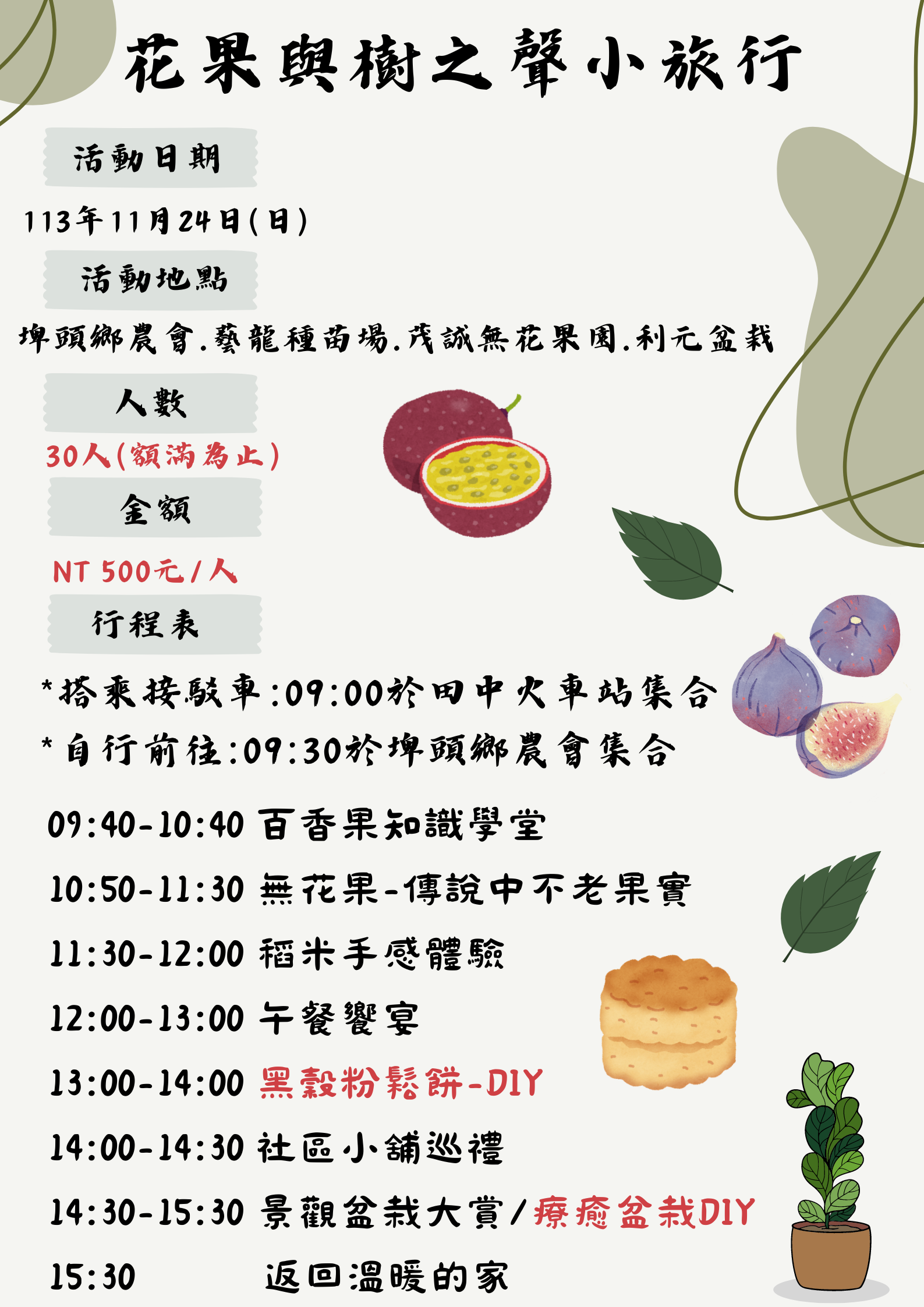 活動日期:11月24日(日) 活動內容:百香果知識學堂、無花果-傳說中不老果實、稻米手感體驗、黑穀粉鬆餅DIY、療癒盆栽DIY 聯絡資訊:04-8922211#508 蔡小姐