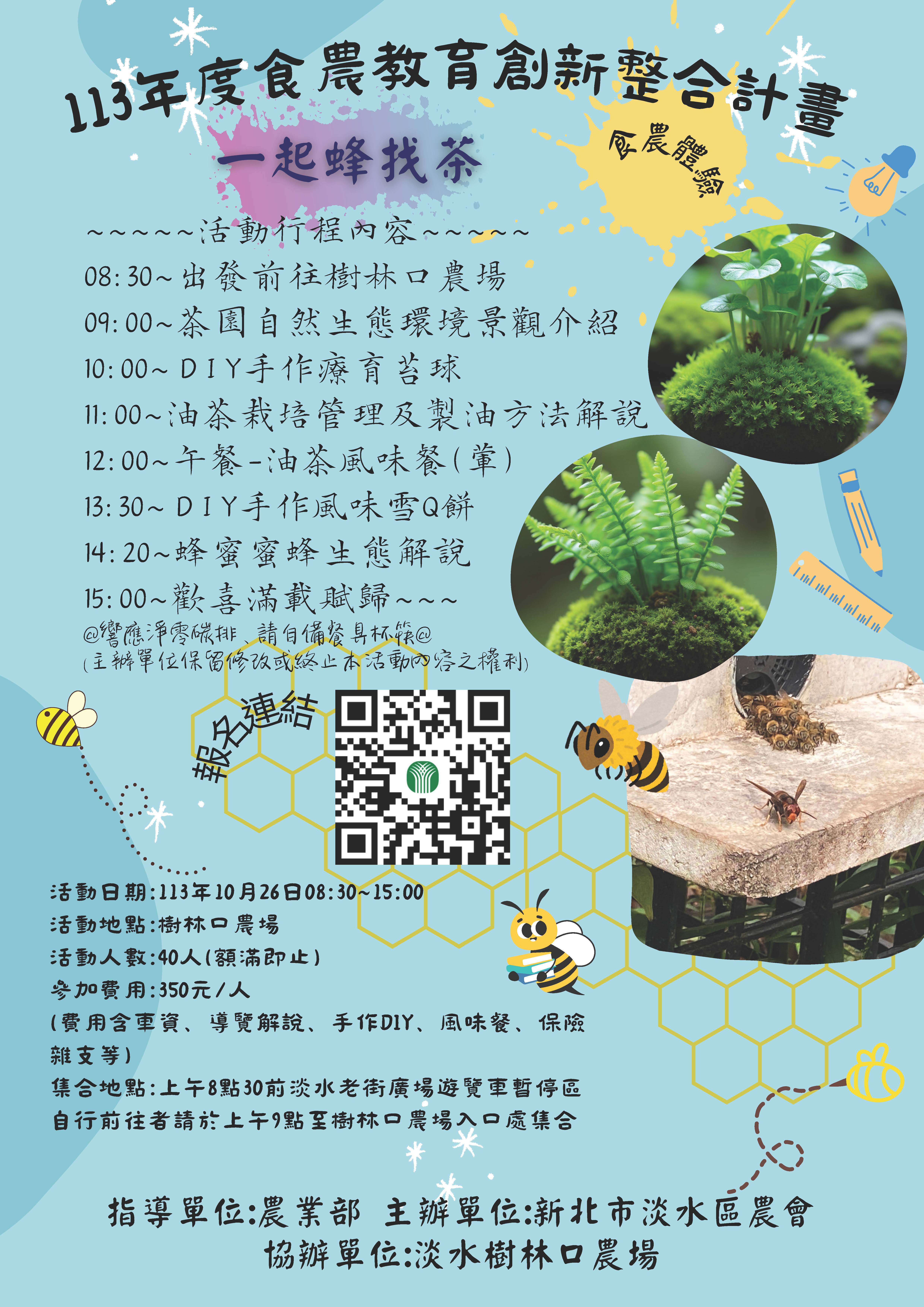 活動日期:10月26日 活動內容:茶園自然生態環境景觀介紹、DIY手作療育苔球、油茶栽培管理及製油方法、DIY風味雪Q餅、蜂蜜生態解說 指導單位:農業部 主辦單位:新北市淡水區農會 協辦單位:淡水樹林口農場