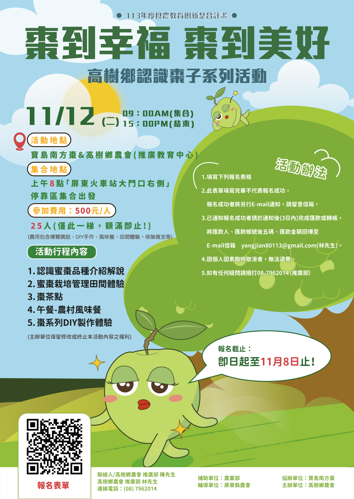活動日期:11/12 活動內容:認識蜜棗、田間體驗、棗茶點、DIY 連絡電話:08-7962014 推廣部 林先生、陳先生 補助單位:農業部 輔導單位:屏東縣農會 協辦單位:寶島南方棗 主?單位:高樹鄉農會