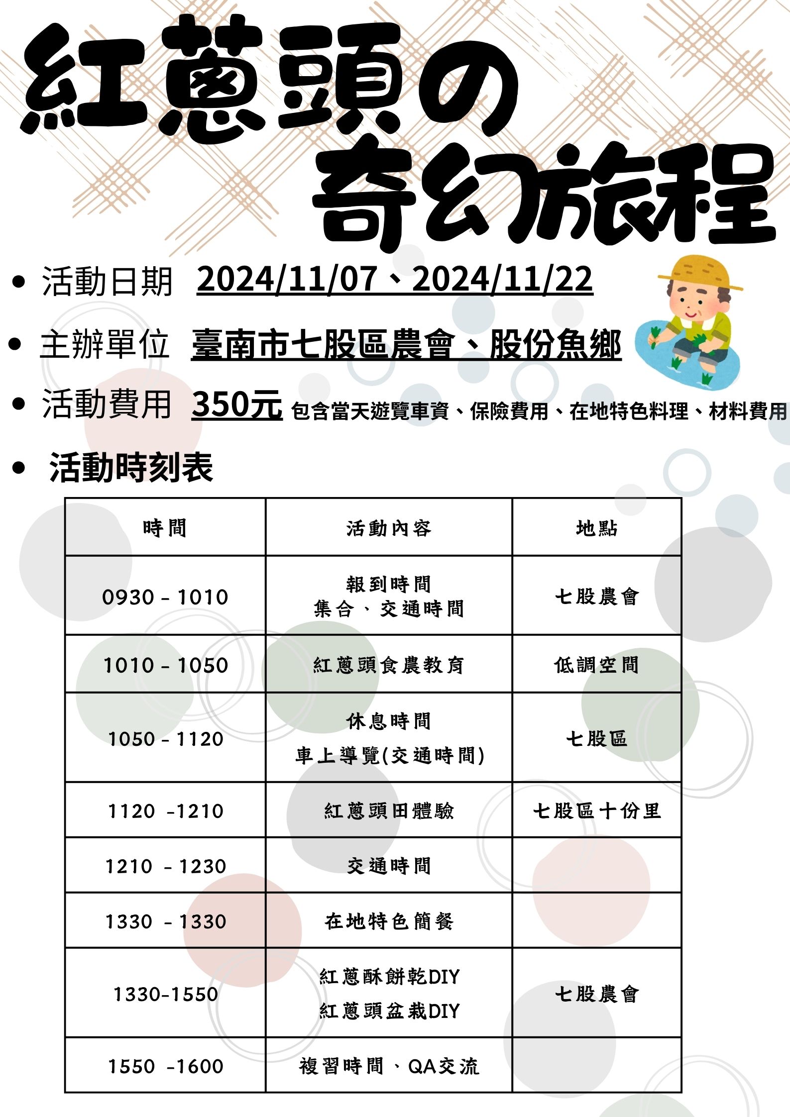 活動日期:11/7、11/22;11/2、11/23 活動內容:紅蔥頭食農教育、紅蔥頭田體驗、紅蔥酥餅乾DIY、紅蔥頭盆栽DIY、紅蔥頭食物染DIY 聯絡電話:06-7871711#303 陳小姐 主辦單位:臺南市七股區農會、股份魚鄉