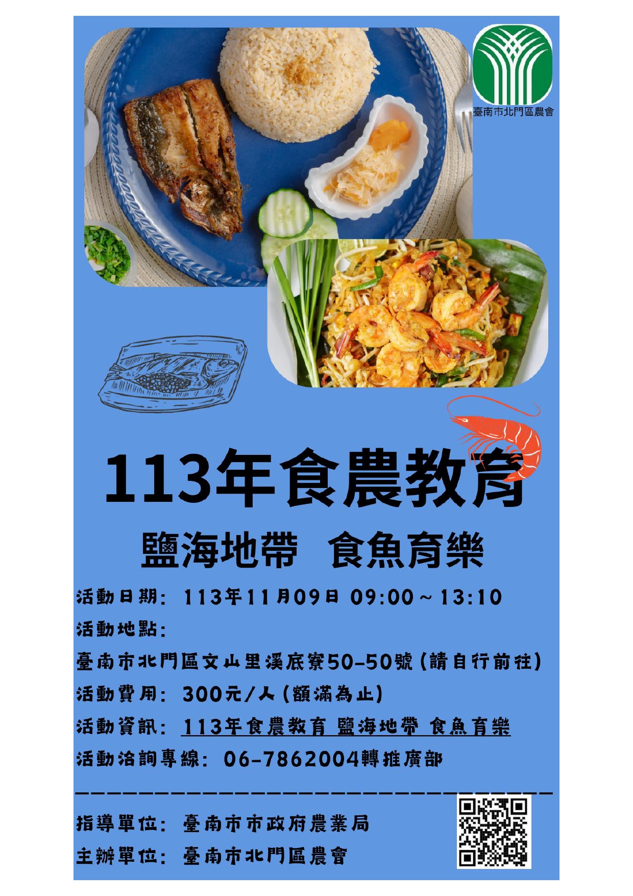 活動日期:11/9 活動內容:食農簡報、蝦兵魚將、食魚釣釣樂、食農DIY 洽詢專線:06-7862004 轉推廣部 指導單位:臺南市政府農業局 主辦單位:臺南市北門區農會