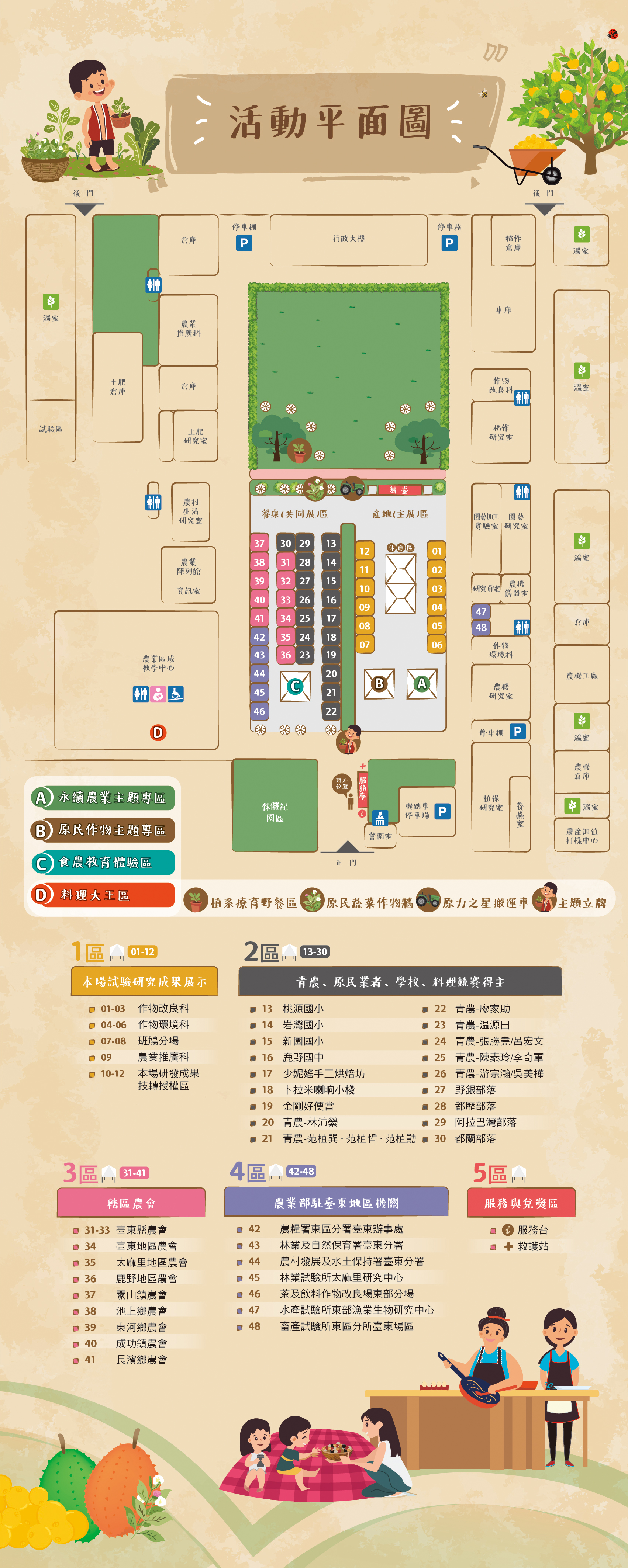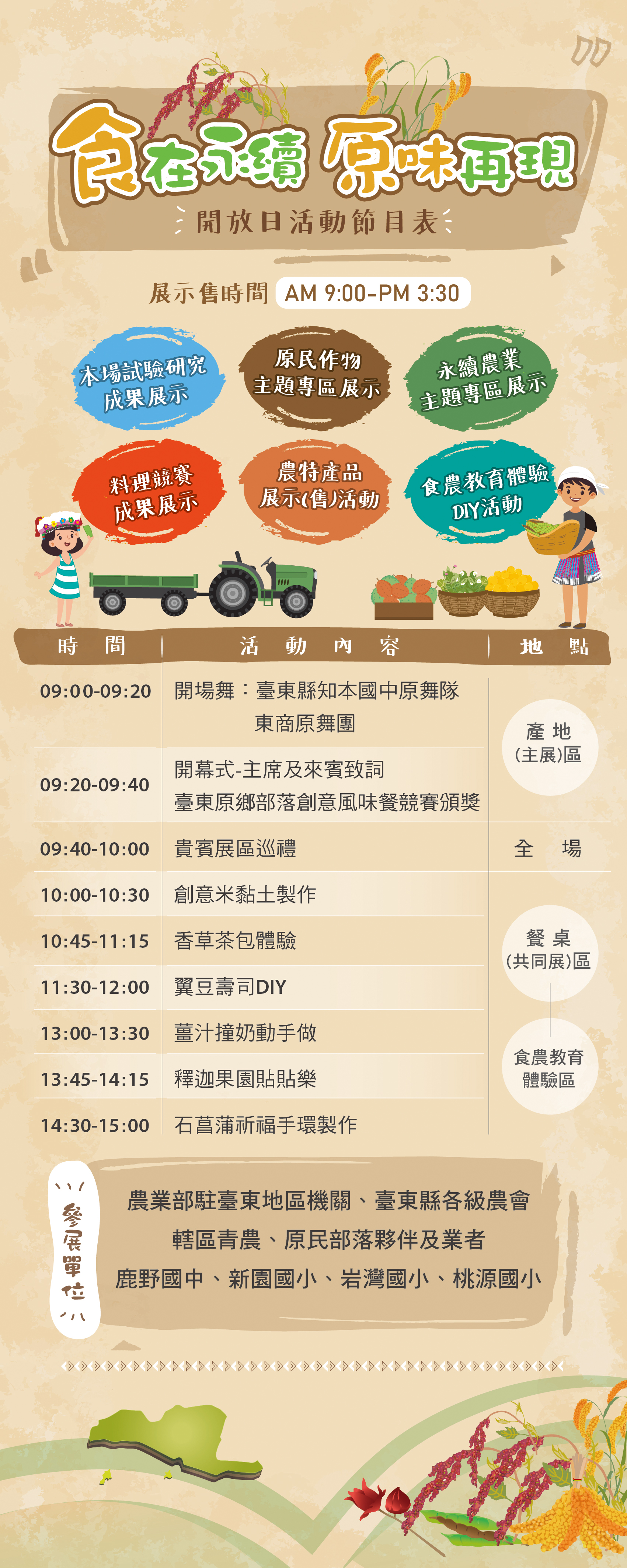 一、活動內容:臺東區農業改良場及農業部駐臺東地區機關研發成果展示,以及臺東地區青農、原住民族部落夥伴、料理競賽得主、學校、縣內各級農會等辦理農產品展示(售)。 二、活動節目表及活動平面圖如下: