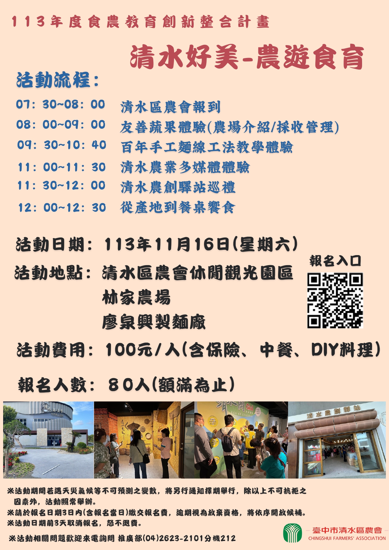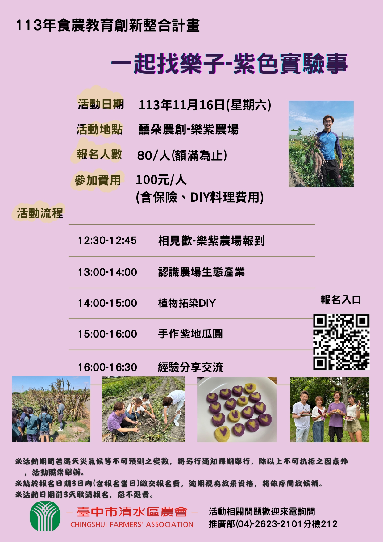 活動日期:11月16日(星期六) 活動內容:友善蔬果體驗、百年手工麵線工法教學體驗、清水農業多媒體體驗、清水農創驛站巡禮;認識農場生態產業、植物拓染DIY、手作紫地瓜圓 詢問專線:推廣部(04)26232101分機212
