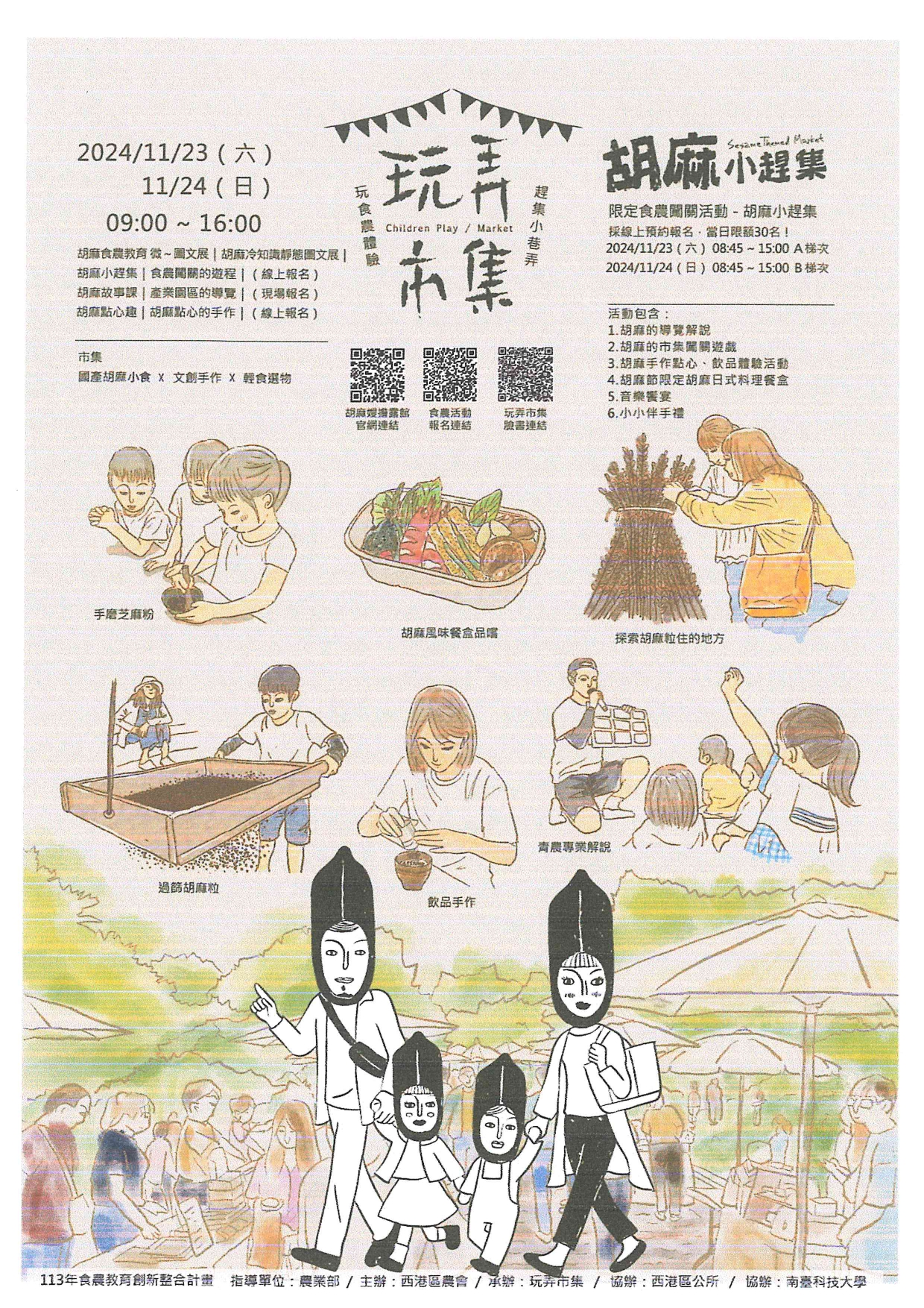 活動日期:113年11月23-24日 活動內容:胡麻導覽解說、胡麻市集闖關遊戲、胡麻手作點心、飲品體驗活動、胡麻節限定胡麻日式料理餐盒、音樂饗宴 指導單位:農業部 主辦單位:西港區農會 承辦單位:玩弄市集 協辦單位:西港區公所、南臺科技大學