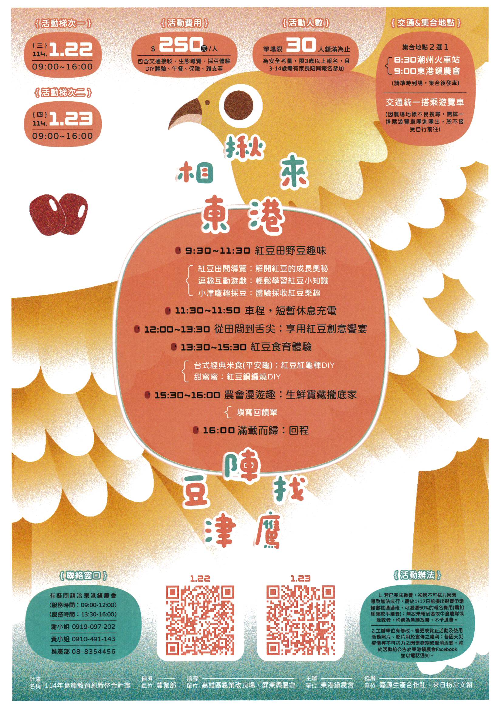▶︎您知道什麼是津鷹紅豆嗎? ▶︎津鷹紅豆跟其他紅豆有什麼差別? ▶︎ 除了常喝到的紅豆湯,還能如何烹調? ▶︎ 想知道一顆小小的紅豆,不僅是甜品中的主角,還承載著什麼豐富的文化與農業知識嗎? ▶︎ 這場知識、趣味互動的紅豆食農教育體驗,能感受紅豆從播種到收穫的生命旅程,了解津鷹紅豆的特殊之處,並親自創作美味的紅豆料理! ▶︎ 歡迎有興趣的大小朋友,把握這次食農教育的體驗活動,邀請您與家人一同走進紅豆田,親手探索紅豆的成長奧秘及學習食材背後的故事,感受土地與人情的溫暖! 活動日期:1/22(三)、1/23(四) 活動內容:紅豆田野豆趣味、從田間到舌尖、紅豆食育體驗、農會漫遊趣 輔導單位:農業部 指導單位:高雄區農業改良場、屏東縣農會 主辦單位:東港鎮農會 協辦單位:嘉源生產合作社、來日枋常文創