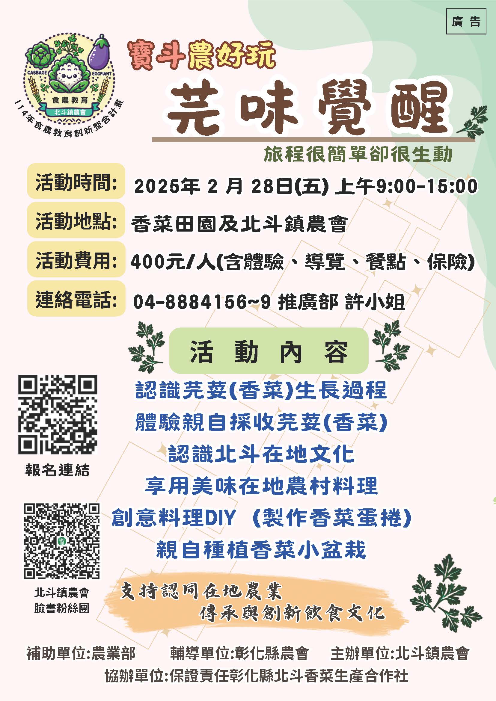 活動日期:2月28日(星期五) 活動地點:香菜田園及北斗鎮農會 連絡電話:04-888456~9推廣部許小姐 活動內容:認識芫荽(香菜)生長過程、體驗親自採收芫菜、認識北斗在地文化、創料料理DIY、種植香菜小盆栽 補助單位:農業部 輔導單位:彰化縣農會 主辦單位:北斗鎮農會 協辦單位:保證責任彰化縣北斗香菜生產合作社