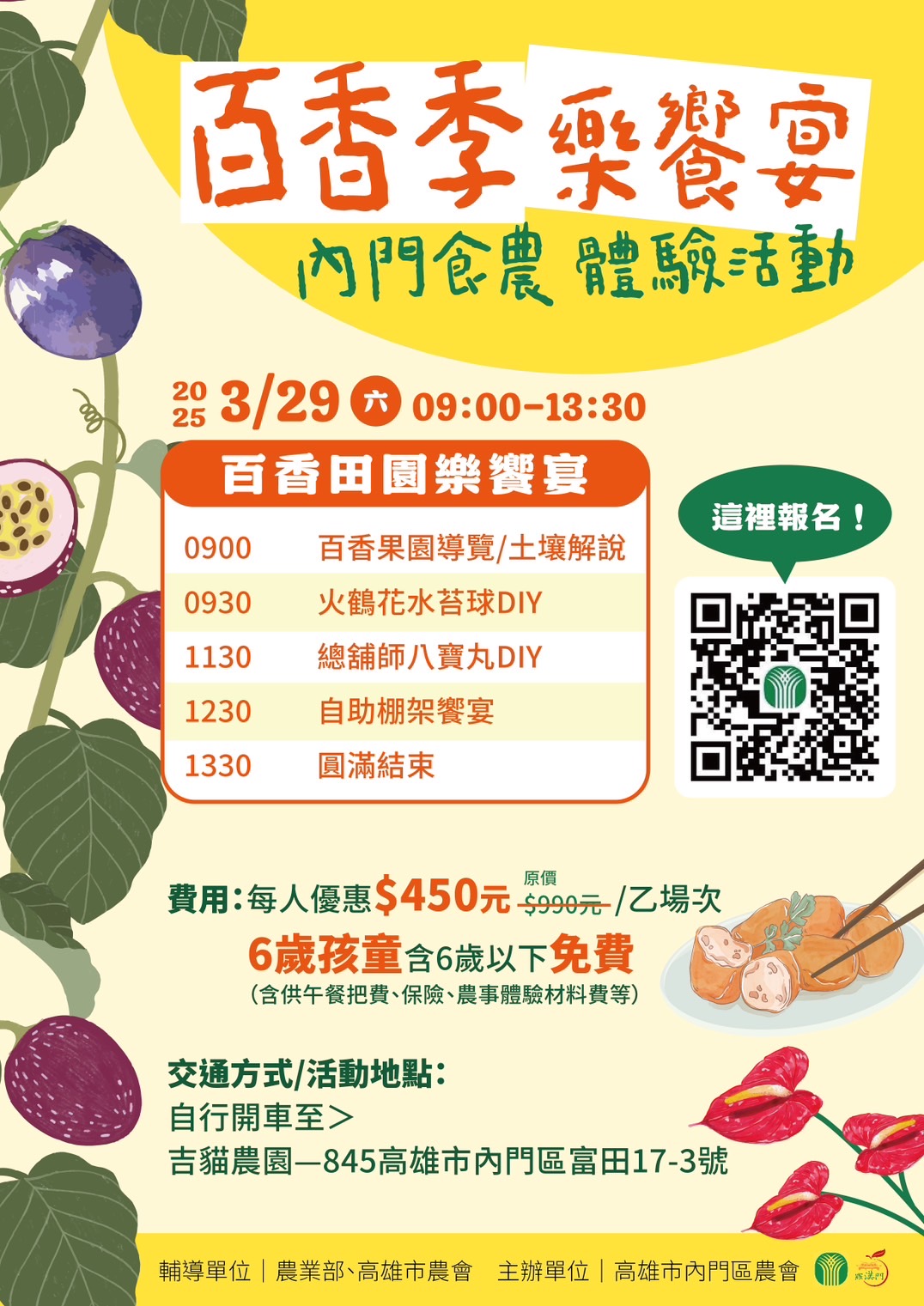 活動日期:3月02日(星期日)、3月29日(星期六) 活動地點:吉貓農園(高雄市內門區富田17-3號) 活動內容:百香果園導覽/土壤解說、竹(藤)編DIY、總舖師八寶丸DIY、自助棚架饗宴 輔導單位:農業部、高雄市農會 主辦單位:高雄市內門區農會