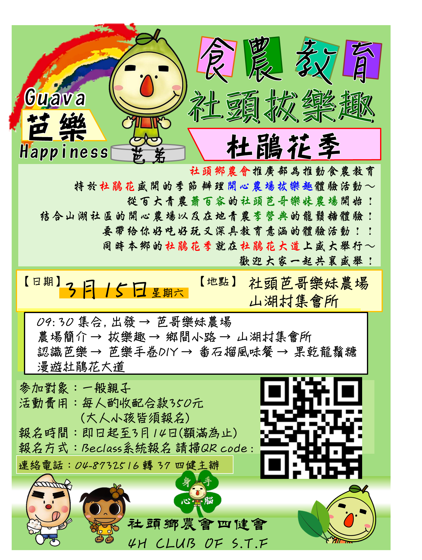 活動目的:為推廣食農教育,推動休閒農業並促進在地產業多角化發展,同時培養國人正確食農教育相關認知,特辦理本體驗活動。 活動日期:3月15日(六) 活動內容:農場簡介、拔樂趣、認識芭樂、芭樂手卷DIY、番石榴風味餐、果乾龍鬚糖 連絡電話:04-8732516轉37