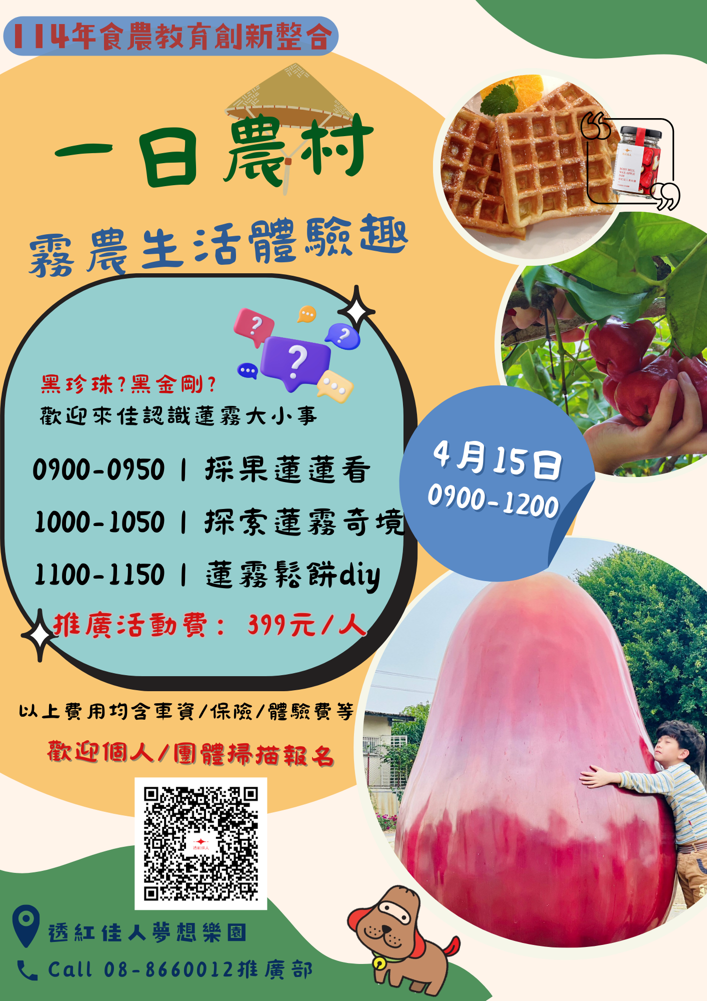 活動日期:4月15日 活動內容:採果蓮蓮看、探索蓮霧奇境、蓮霧鬆餅DIY 活動地點:透紅佳人夢想樂園 洽詢專線:08-8660012 推廣部