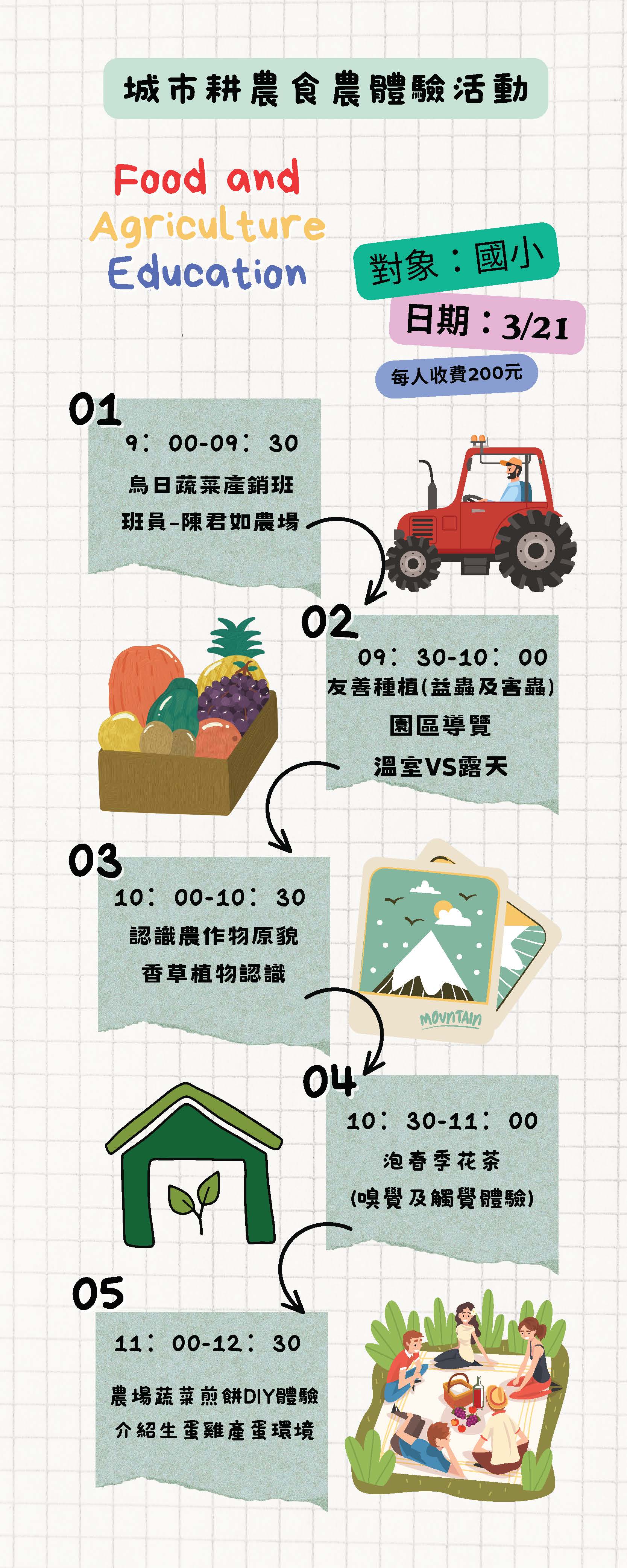 活動日期:3月21日 活動內容:友善種植園區導覽、認識農作物原貌香草植物認識、泡春季花茶、農場蔬菜煎餅DIY 連絡電話:04-23376150分機1223 主辦單位:烏日區農會