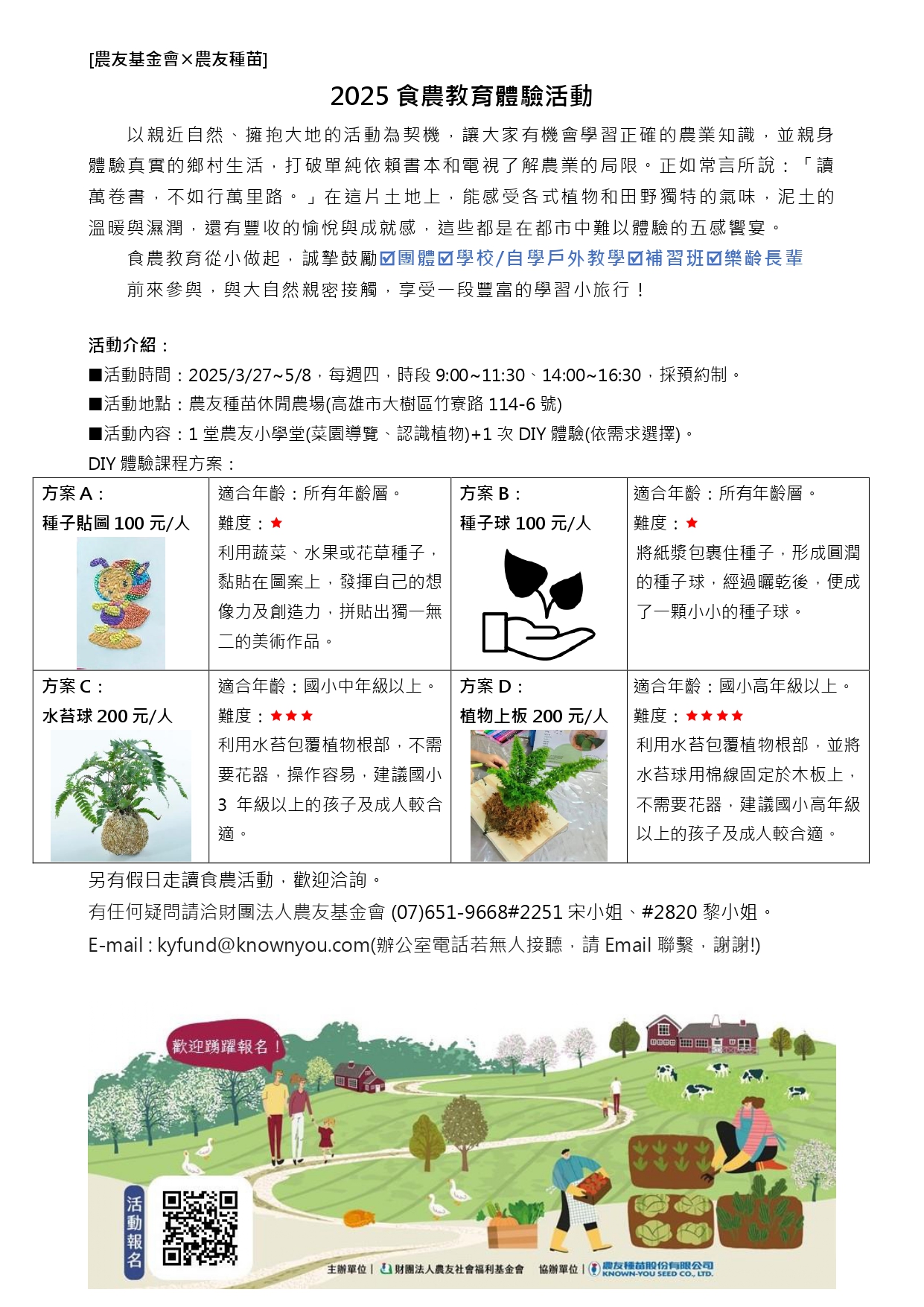 以「蔬菜作物」為主題規劃一系列體驗課程,期望透過蔬菜種植區,讓學童能夠親身體驗蔬菜從種植到收成的過程,無論是學生或一般民眾,都可以從實地觀察和動手做課程中,有機會學習到正確的農業知識、啟發孩子們對農業的好奇心,並培養他們對環境與食物的珍惜與愛護。 1.活動對象:歡迎團體報名參加,每梯次限20~50人。 2.活動期程:2025年3/27~5/8,每週四,採預約制。 3.每日時間:各分為上午(9:00)、下午(14:00),每梯次約2.5小時。 4.活動地點:農友種苗大樹休閒農場(高雄市大樹區竹寮路114-6號,舊鐵橋溼地公園斜對面)。 5.活動內容:1堂小學堂免費課程(視學齡程度安排菜園導覽、認識植物)+1堂DIY體驗手作(付費)。 連絡電話:(07)651-9668#2251宋小姐、2820黎小姐。