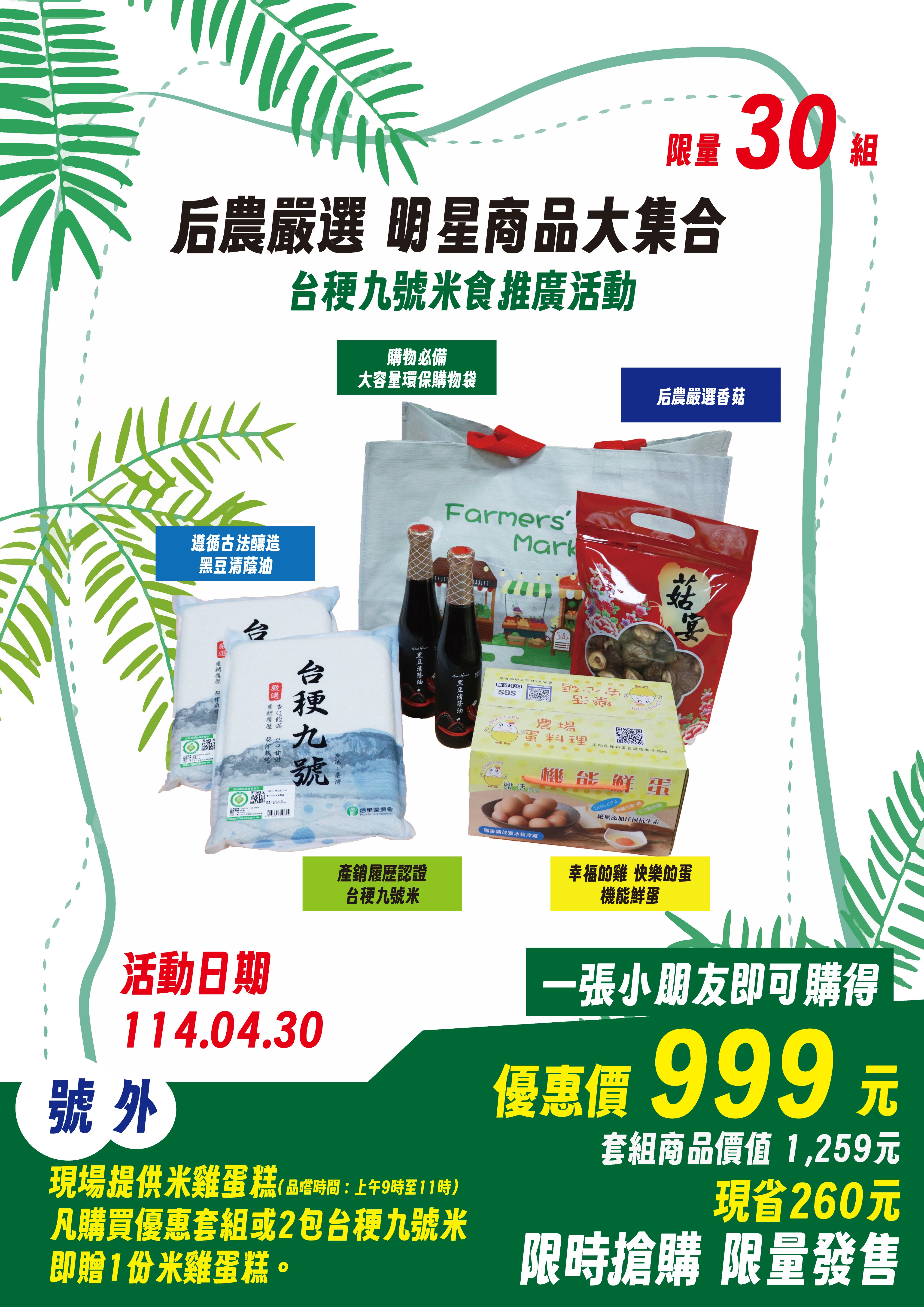 活動時間:4月30日(星期三) 活動地點:后里區農會1樓大廳 活動內容:明星商品優惠大套組 限時限量搶購