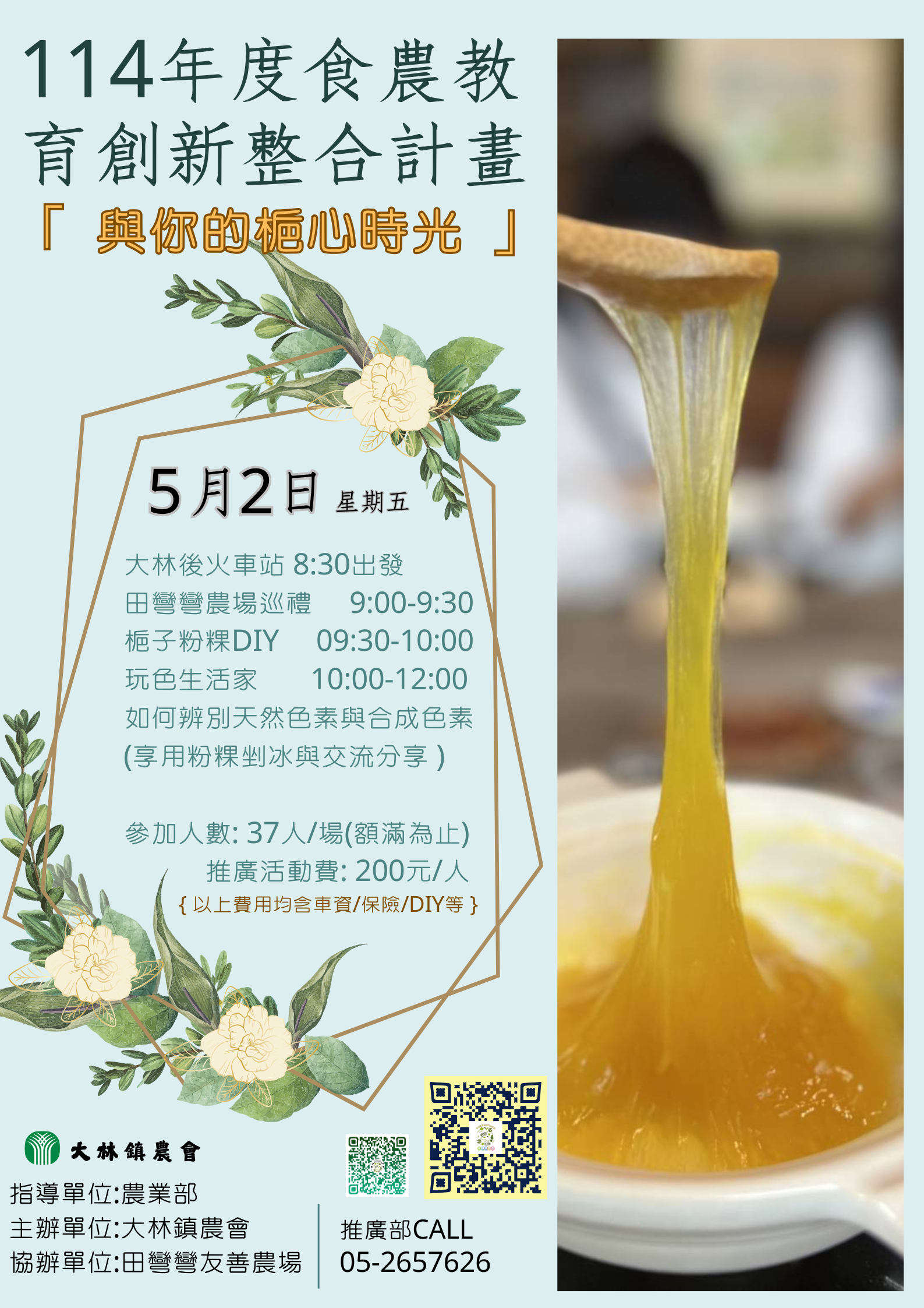 辦理日期:5月2日(星期五) 活動內容:田彎彎農場巡禮、梔子粉粿DIY、玩色生活家、如何辨別天然色素與合成色素 洽詢專線:推廣部 05-2657626 指導單位:農業部 主辦單位:大林鎮農會 協辦單位:田彎彎友善農場