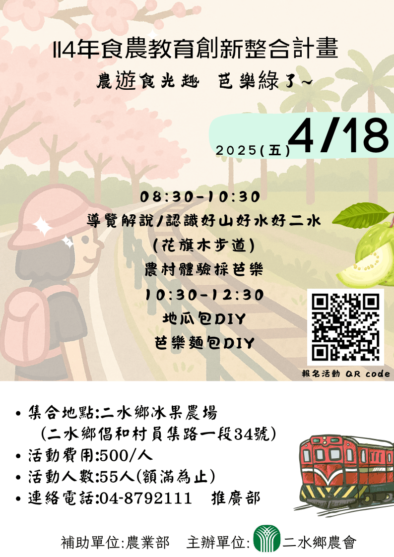 活動日期:4月18日 活動內容:認識好山好水好二水、農村體驗採芭樂、地瓜包DIY、芭樂麵包DIY 連絡電話:04-8792111 推廣部 補助單位:農業部 主辦單位:二水鄉農會