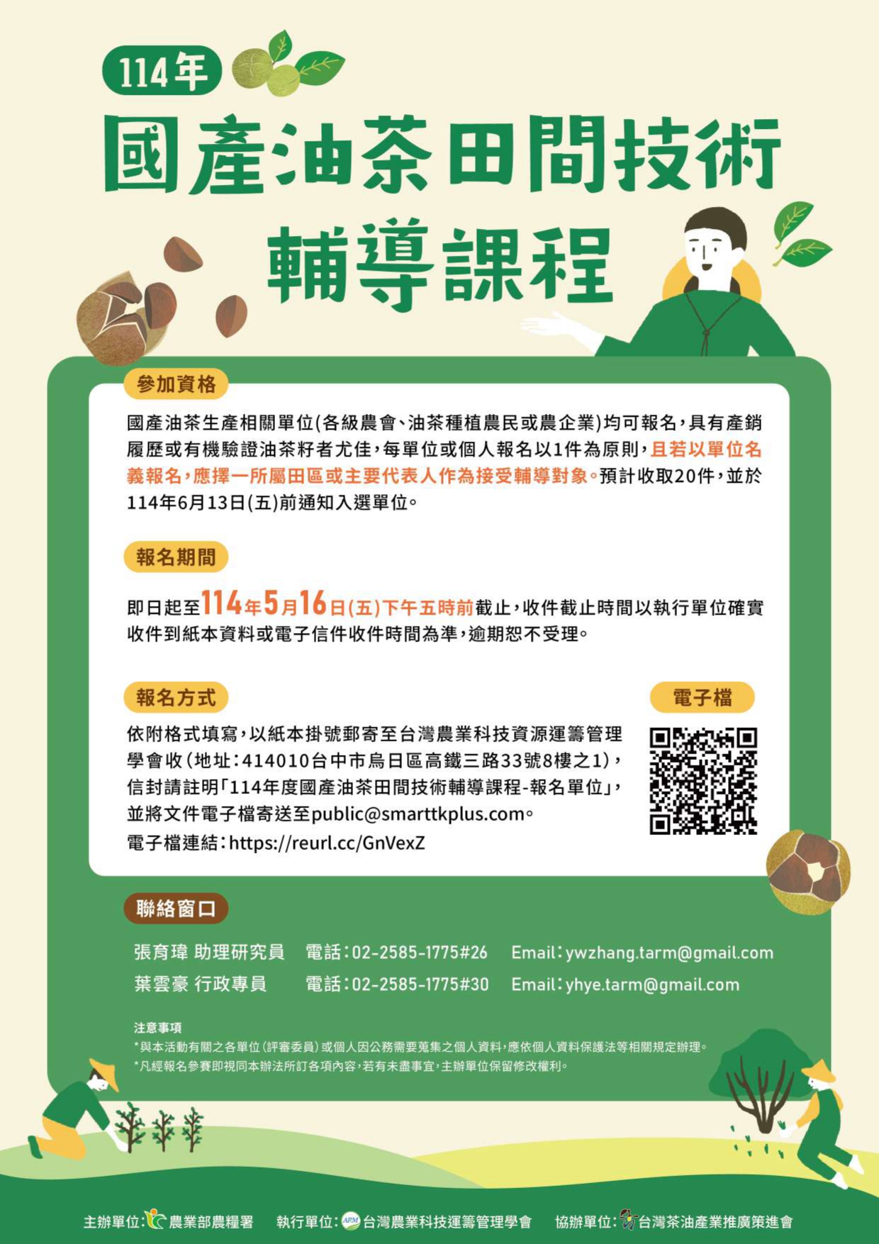 一、目的:協助各地油茶產業強化田間栽培觀念與管理技術,特規劃辦理旨揭課程,提供專家田間診斷與一對一輔導服務。藉由優化栽培管理模式,提升茶籽品質與產量,進而增強市場競爭力,促進油茶產業永續發展。 二、參加辦法:詳如連結,https://reurl.cc/GnVexZ 。 三、有意參加者於114年5月16日(星期五)下午五時前完成報名資料繳交作業。報名 資料以紙本掛號郵寄或電子郵件寄送至社團法人台灣農業科技資源運籌管理學會。 四、聯絡窗口:張育瑋助理研究員(電話:02-25851775分機26;E-mail: ywzhang.tarm@gmail;葉雲豪行政專員(電話:02-25851775 分機30; yhye.tarm@gmail.com)。