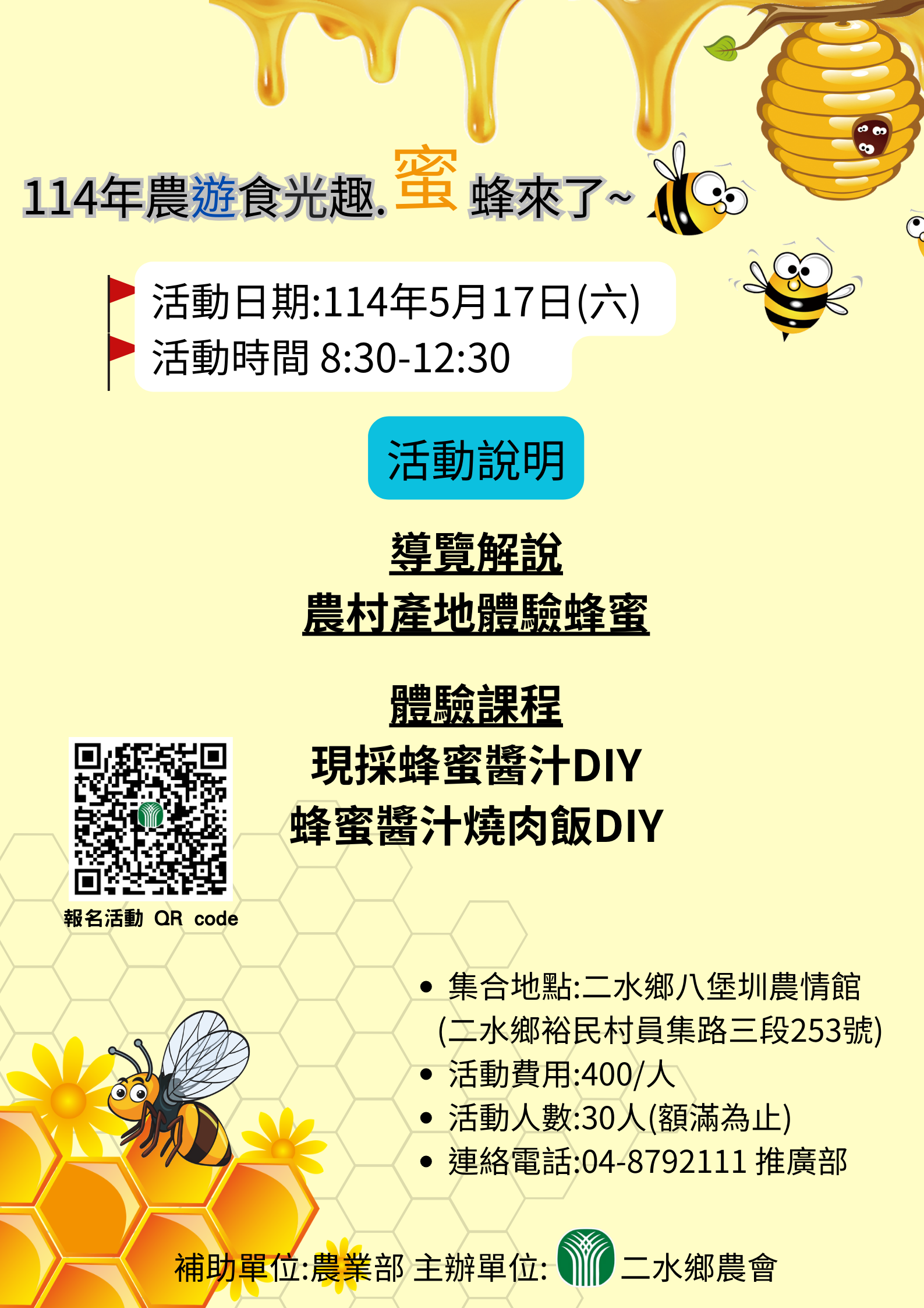 活動日期:5/17 活動內容:農村產地體驗蜂蜜、現採蜂蜜醬汁DIY、蜂蜜醬汁燒肉飯DIY 連絡電話:04-8792111 推廣部 補助單位:農業部 主辦單位:二水鄉農會