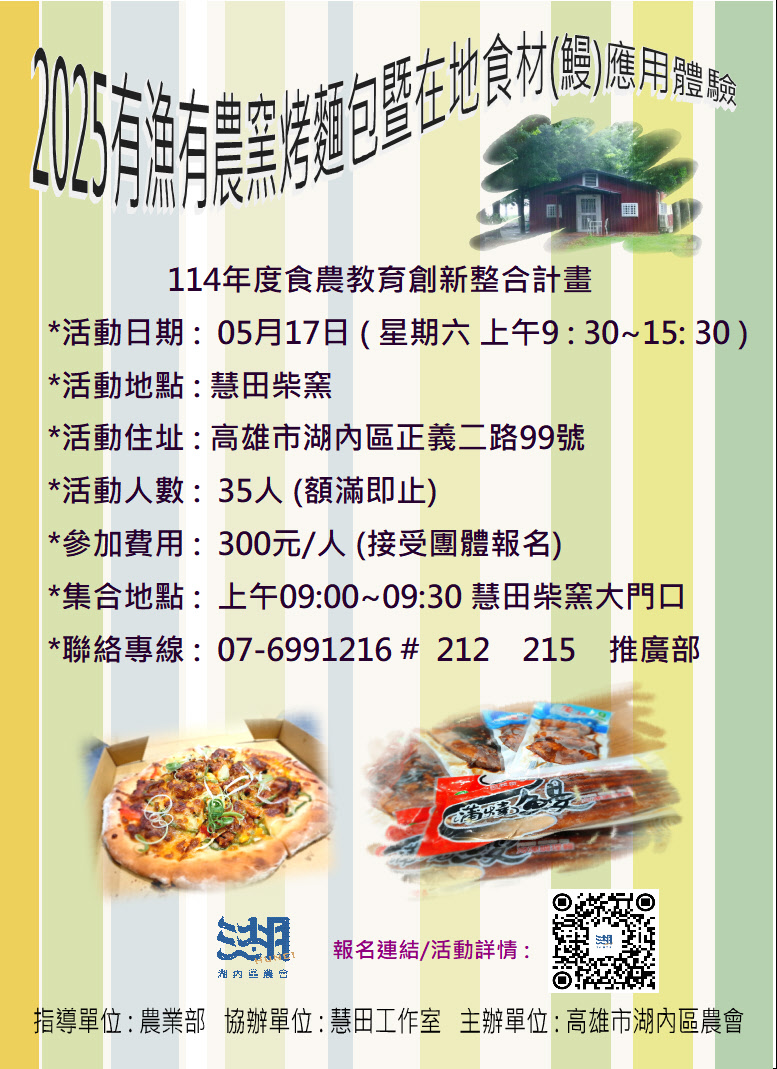 活動日期:5月17日 活動地點:慧田柴窯 聯絡專線:07-6991216#212、215 推廣部 指導單位:農業部 協辦單位:慧田工作室 主辦單位:高雄市湖內區農會