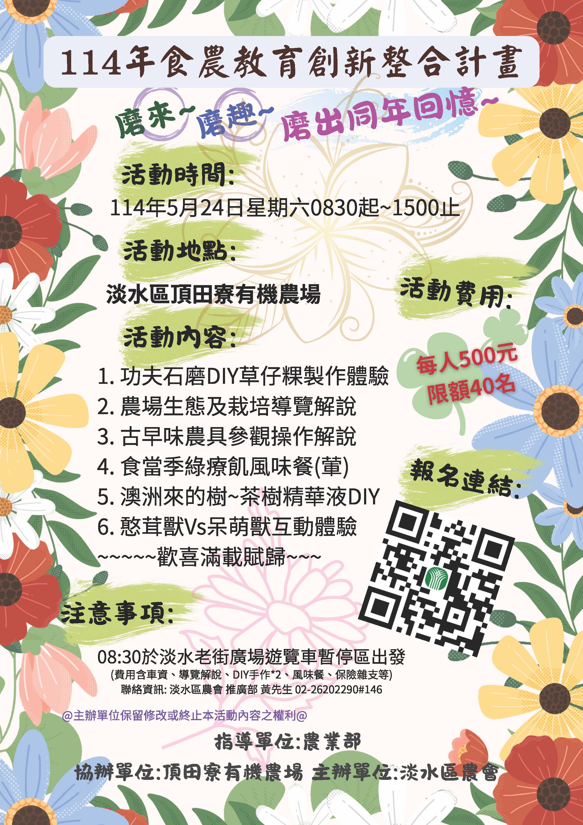 活動日期:5/24 活動內容:功夫石磨DIY草仔粿、農場生態及栽培導覽解說、古早味農具參觀操作解說、茶樹精華液DIY 聯絡資訊:02-26202290#146 推廣部 黃先生 指導單位:農業部 主辦單位:淡水區農會 協辦單位:頂田寮有機農場