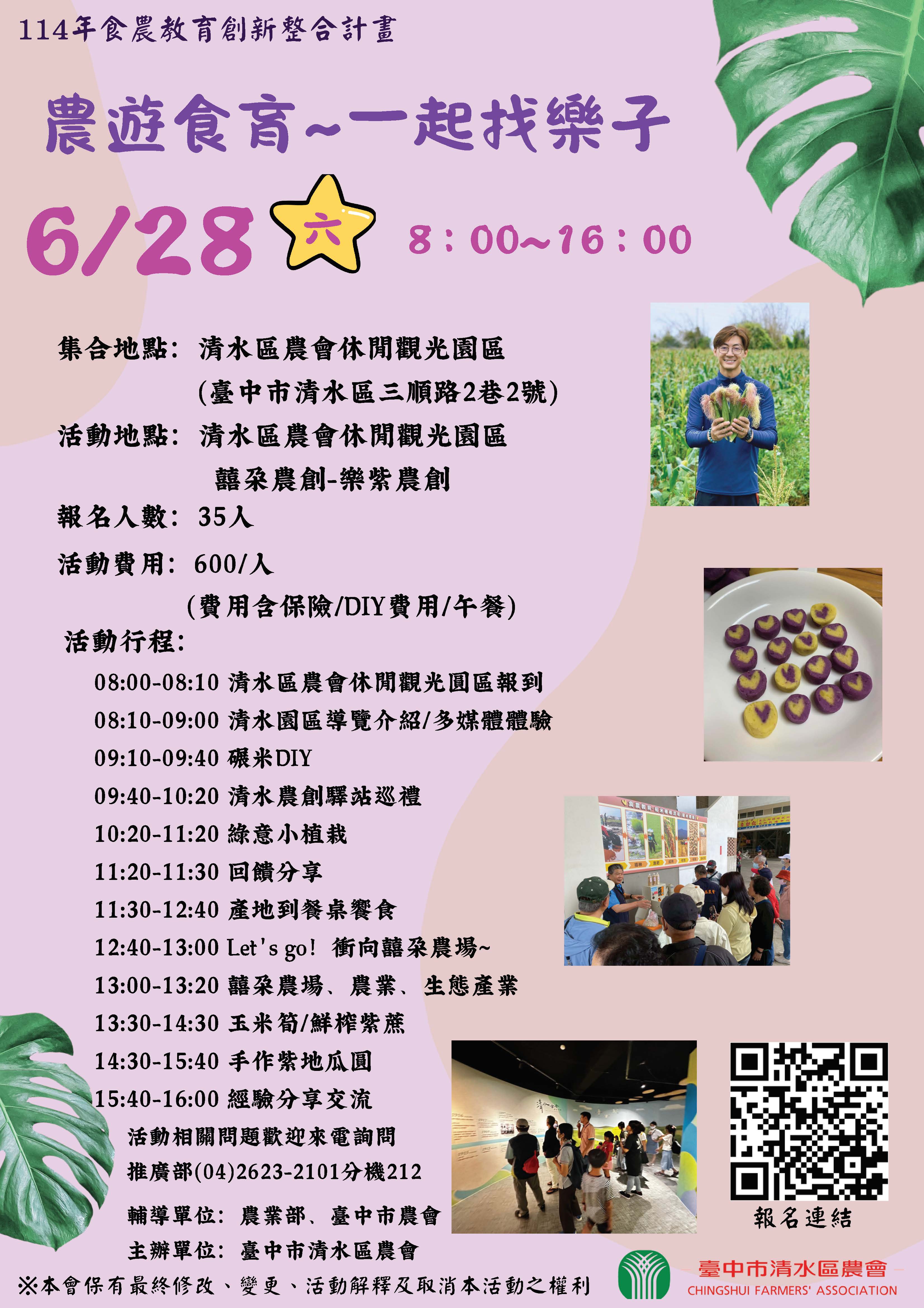 活動日期:6月28日 活動內容:清水園區導覽介紹、碾米DIY、清水農創驛站巡禮、綠意小植栽、玉米筍/鮮榨紫蔗、手作紫地瓜圓 洽詢電話:04-26232101分機212 推廣部 輔導單位:農業部、臺中市農會 主辦單位:臺中市清水區農會