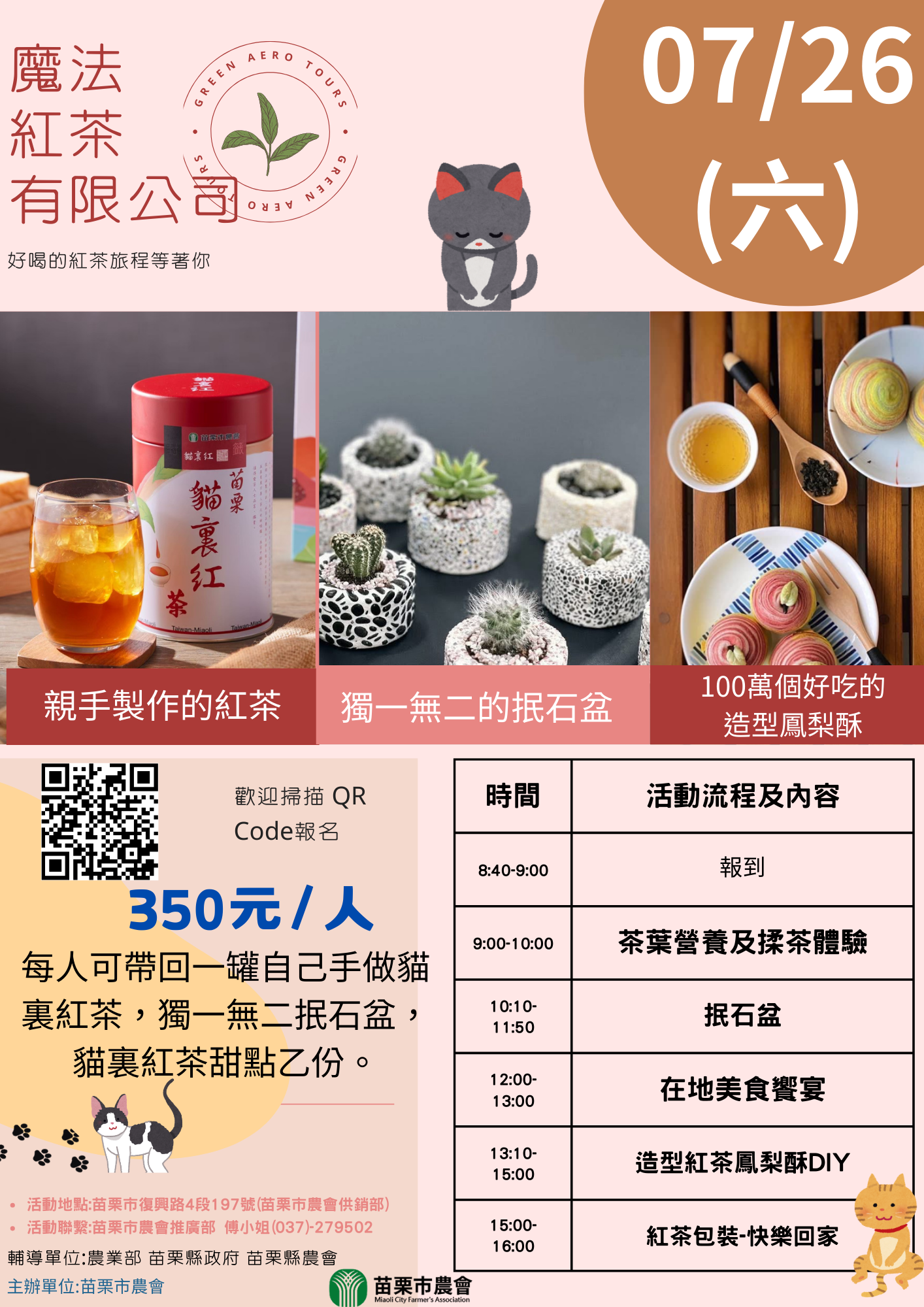 活動日期:7月26日 活動內容:茶葉營養及揉茶體驗、抿石盆、造型紅茶鳳梨酥DIY、紅茶包裝 洽詢電話:苗栗市農會推廣部傅小姐037-279502 輔導單位:農業部、苗栗縣政府、苗栗縣農會 主辦單位:苗栗市農會
