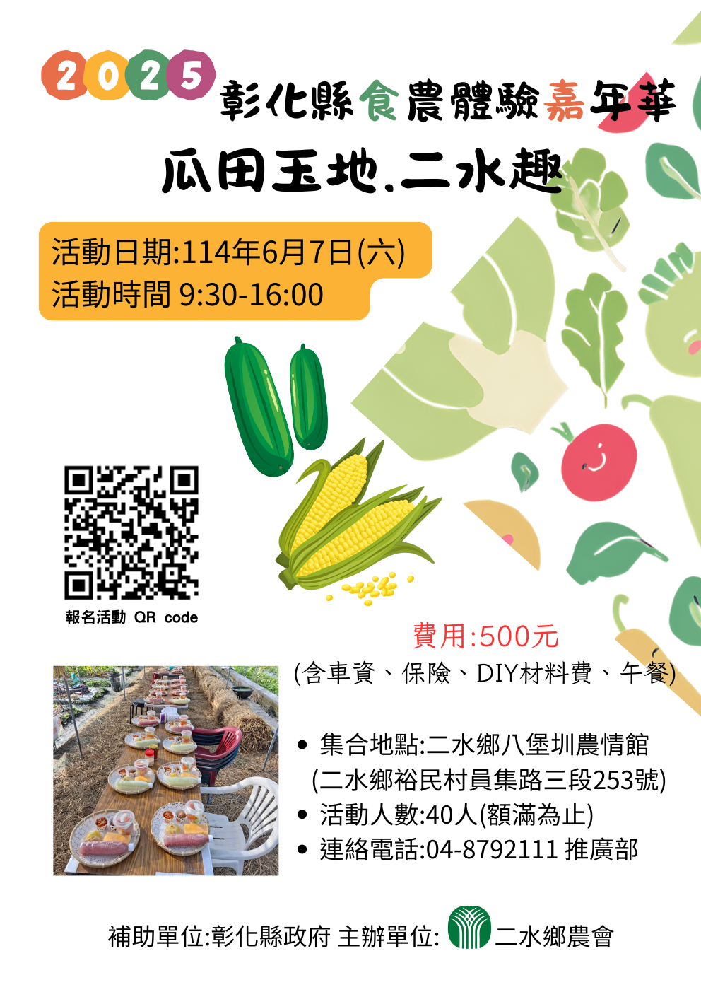 活動日期:6月7日 活動內容:蔡家果園導覽解說、水煮雙色玉米DIY、古早味絲瓜麵線DIY、參訪董坐螺溪硯館、轉廢為寶-玉米葉娃娃DIY 連絡電話:04-8792111 推廣部 補助單位:彰化縣政府 主辦單位:二水鄉農會