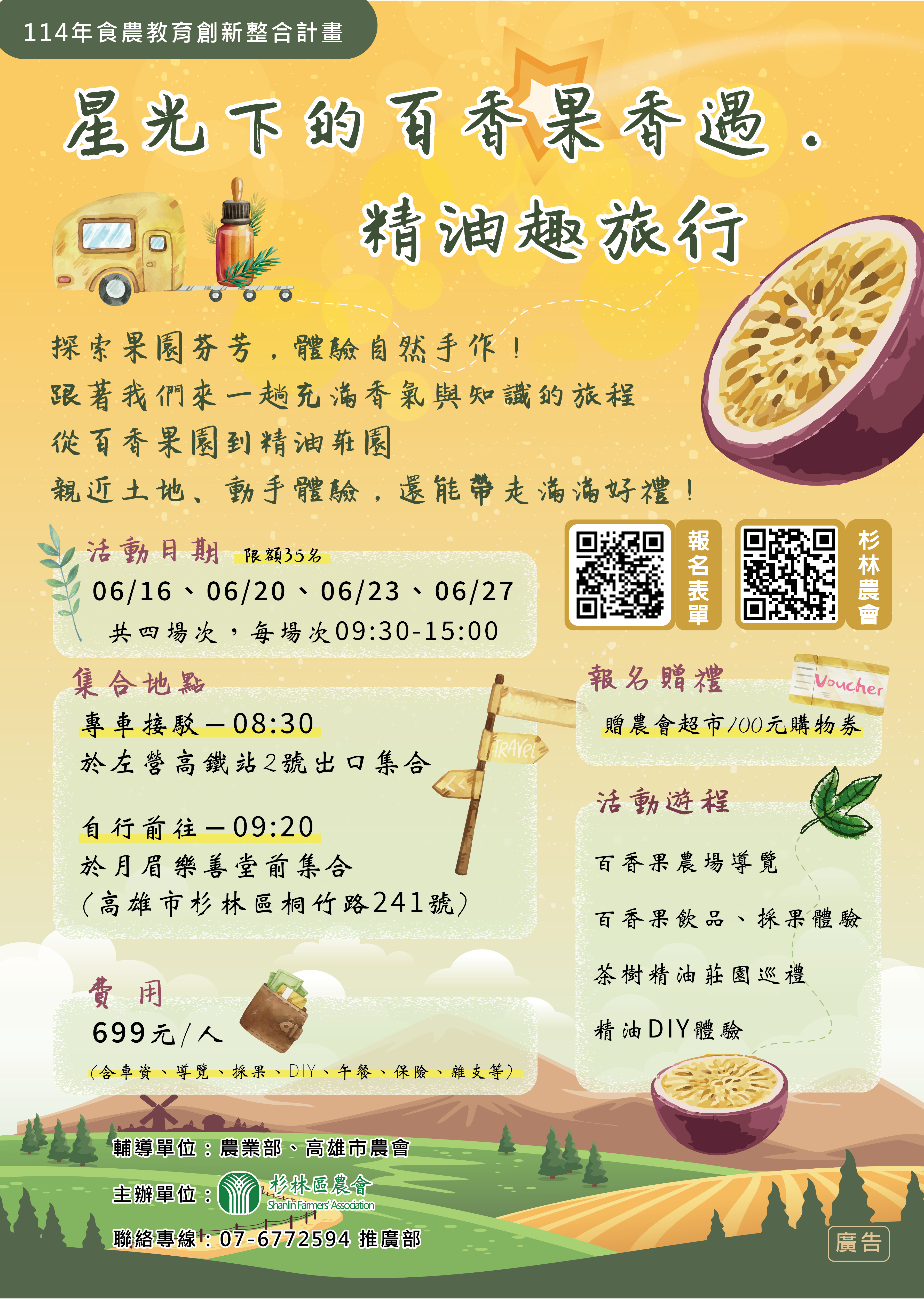 活動日期:6/16、6/20、6/23、6/27 活動內容:百香果農場導覽、百香果飲品、採果體驗、茶樹精油莊園巡禮、精油DIY體驗 聯絡專線:07-6772594 推廣部 輔導單位:農業部、高雄市農會 主辦單位:杉林區農會