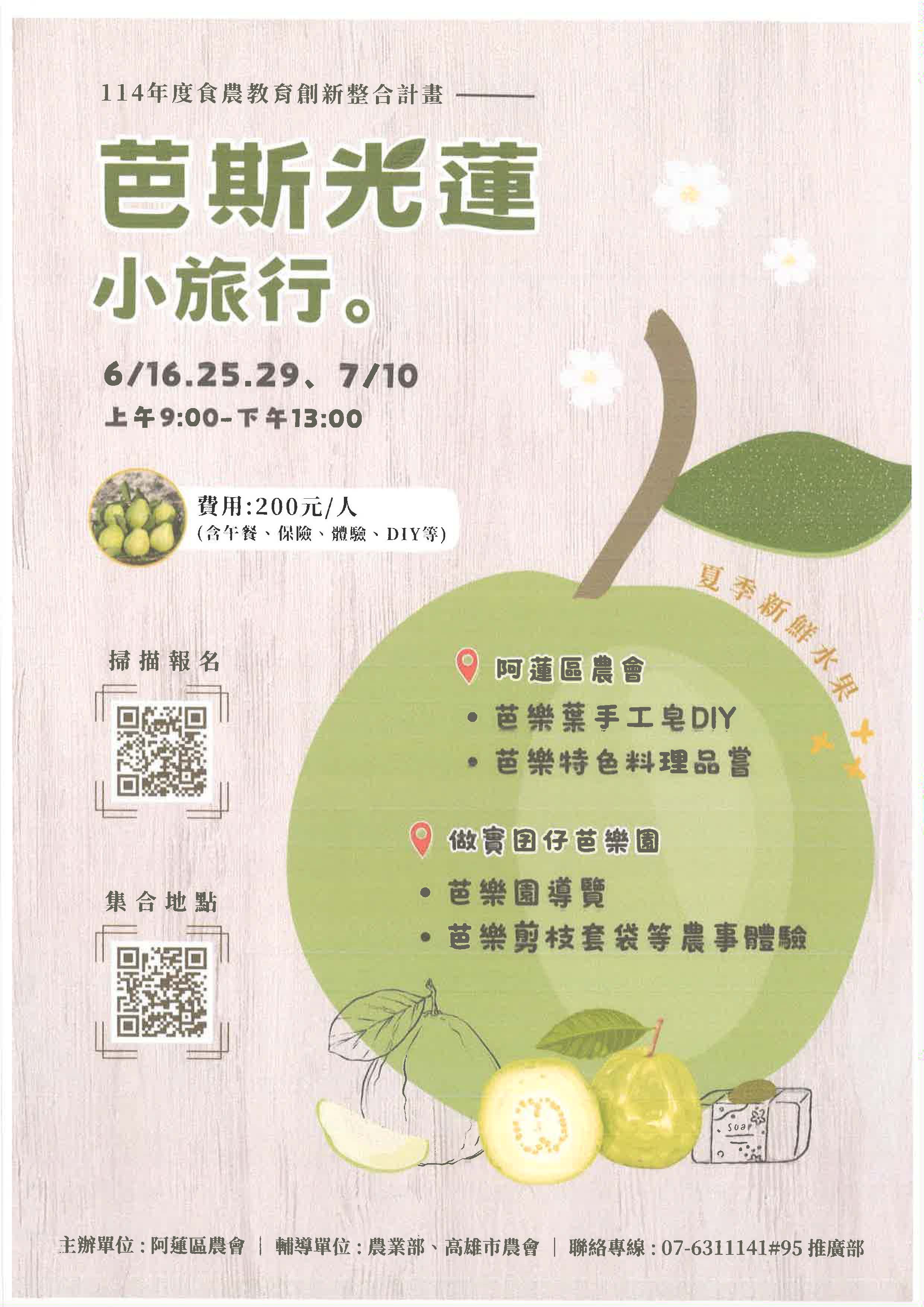 活動日期:6/16.25.29、7/10 活動內容:芭樂葉手工皂DIY、芭樂特色料理品嚐、芭樂園導覽、芭樂剪枝套袋等農事體驗 聯絡專線:07-6311141#95 推廣部 輔導單位:農業部、高雄市農會 主辦單位:阿蓮區農會