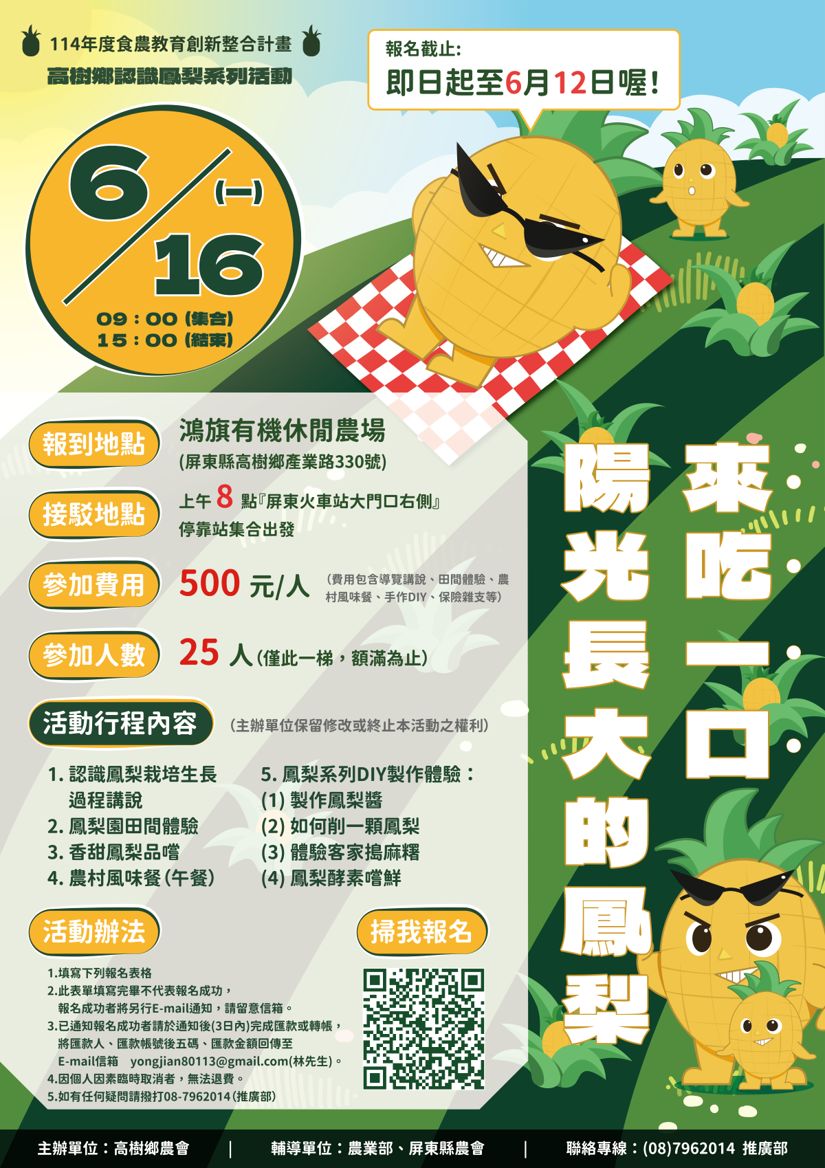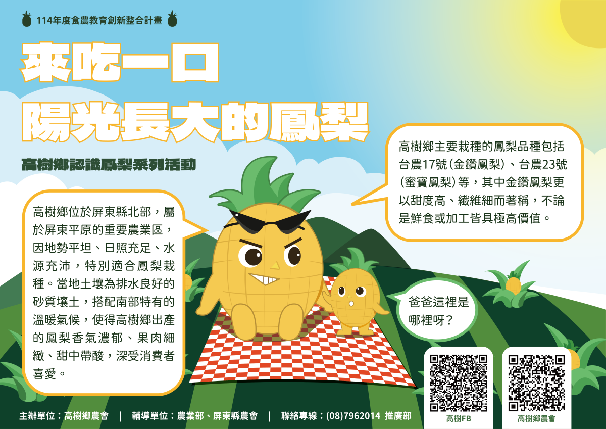 活動日期:6/16 活動內容:認識鳳梨栽培生長、鳳梨園田間體驗、香甜鳳梨品嚐、鳳梨系列DIY製作體驗 洽詢專線:08-7962014 推廣部 輔導單位:農業部、屏東縣農會 主辦單位:高樹鄉農會