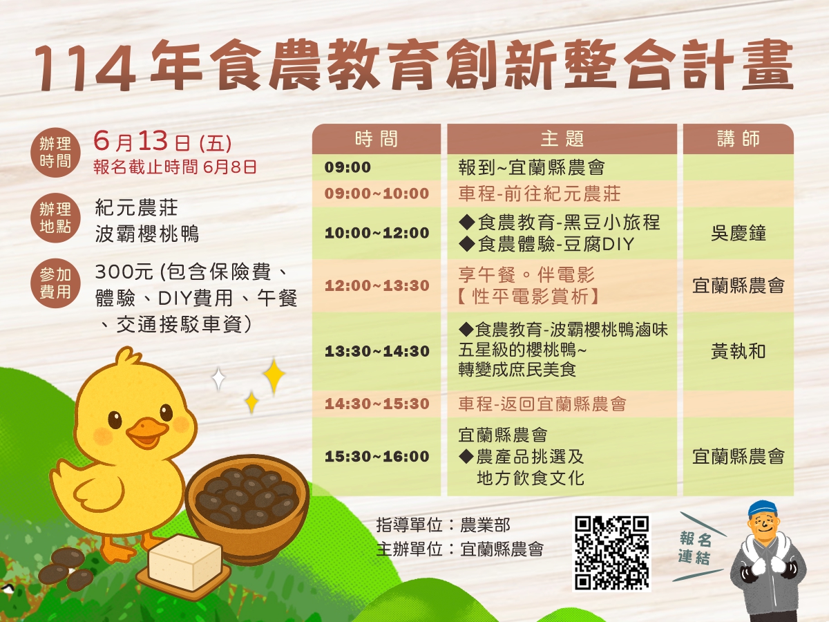 活動日期:6/13 活動內容:黑豆小旅程、豆腐DIY、食農教育-波霸櫻桃鴨滷味 指導單位:農業部 主辧單位:宜蘭縣農會